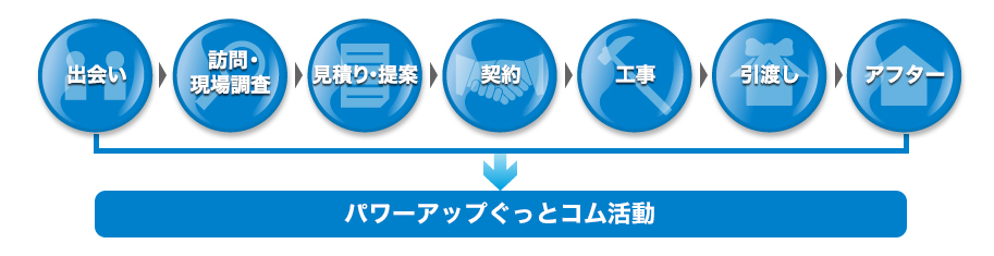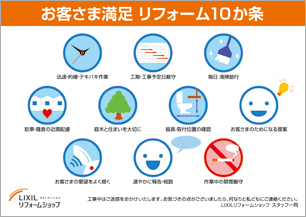 LIXILリフォームショップで行われている「パワーアップぐっとコム活動」では、お客さまとの出会い、契約、さらに工事からアフターフォローまで、すべての段階でのコミュニケーションを大切にし、安心・信頼されるお店づくりに取り組んでいます。33項目ものチェックポイントを設け、高いクオリティでサービスをご提供できるよう努めています。