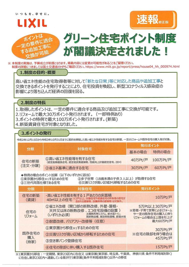 商品や追加工事と交換できるポイントを付与する「グリーン住宅ポイント制度」が創設されました。