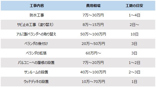 続いて、ベランダのリフォームの費用相場について、工事内容別にご紹介します。