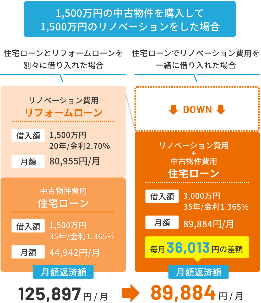 従来では、物件購入は「住宅ローン」、リノベーションは「リフォームローン」に別々に分かれており、リフォームローンは「住宅ローンよりも金利が高く、借入期間が短い」というケースが一般的でした。