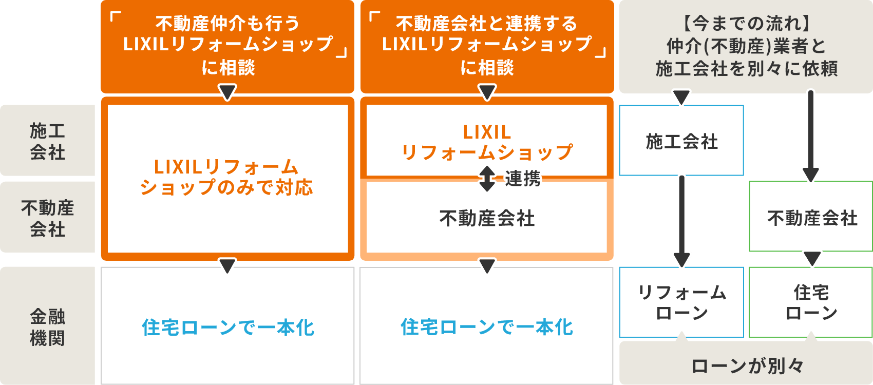 上記のように「不動産仲介も行うLIXILリフォームショップに相談する方法」と、「不動産会社と連携するLIXILリフォームショップに相談する方法」と2パターンございます。