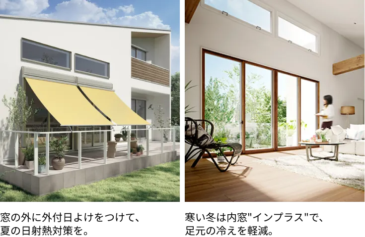 内窓”インプラス”で冬の不快な足元の冷えを抑え、窓の外側に外付日よけを設置し、夏の日射熱対策を。
