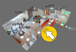 部屋内部が表示され、マウス操作により360°お部屋が見渡せます。また、部屋名表示部分をクリックすれば移動もできます。