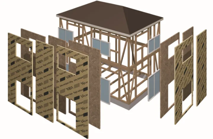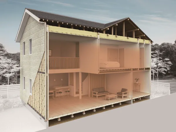 外張り断熱により、柱などの木材が熱橋とならず高い断熱性能を発揮します。