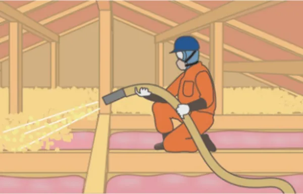 リフォームでの天井断熱に最適な、吹込み用グラスウール。軽い断熱材なので、天井への負荷が少なく、小屋裏空間に断熱材を厚く充填できます。