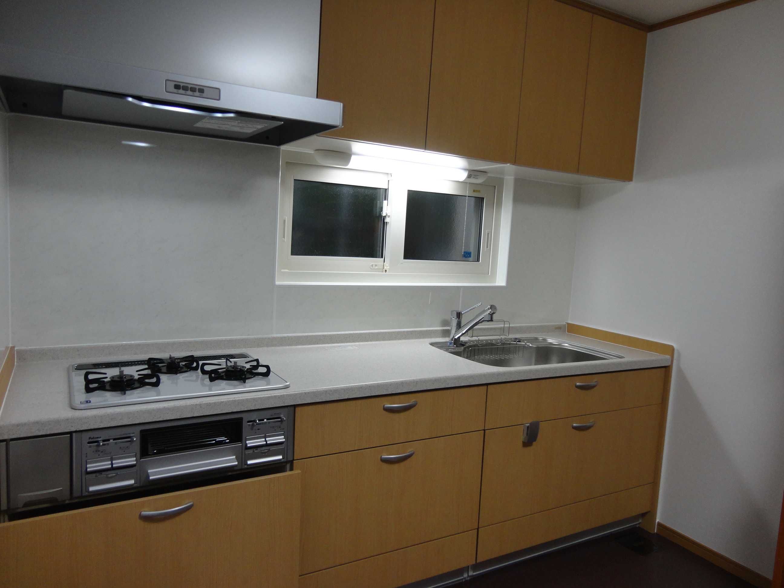 システムキッチンにお取替え。人造大理石のワークトップで汚れもさっとひと吹き、お掃除も楽に!キッチンの扉がスライドタイプで出し入れ楽々、また収納力もアップしました。