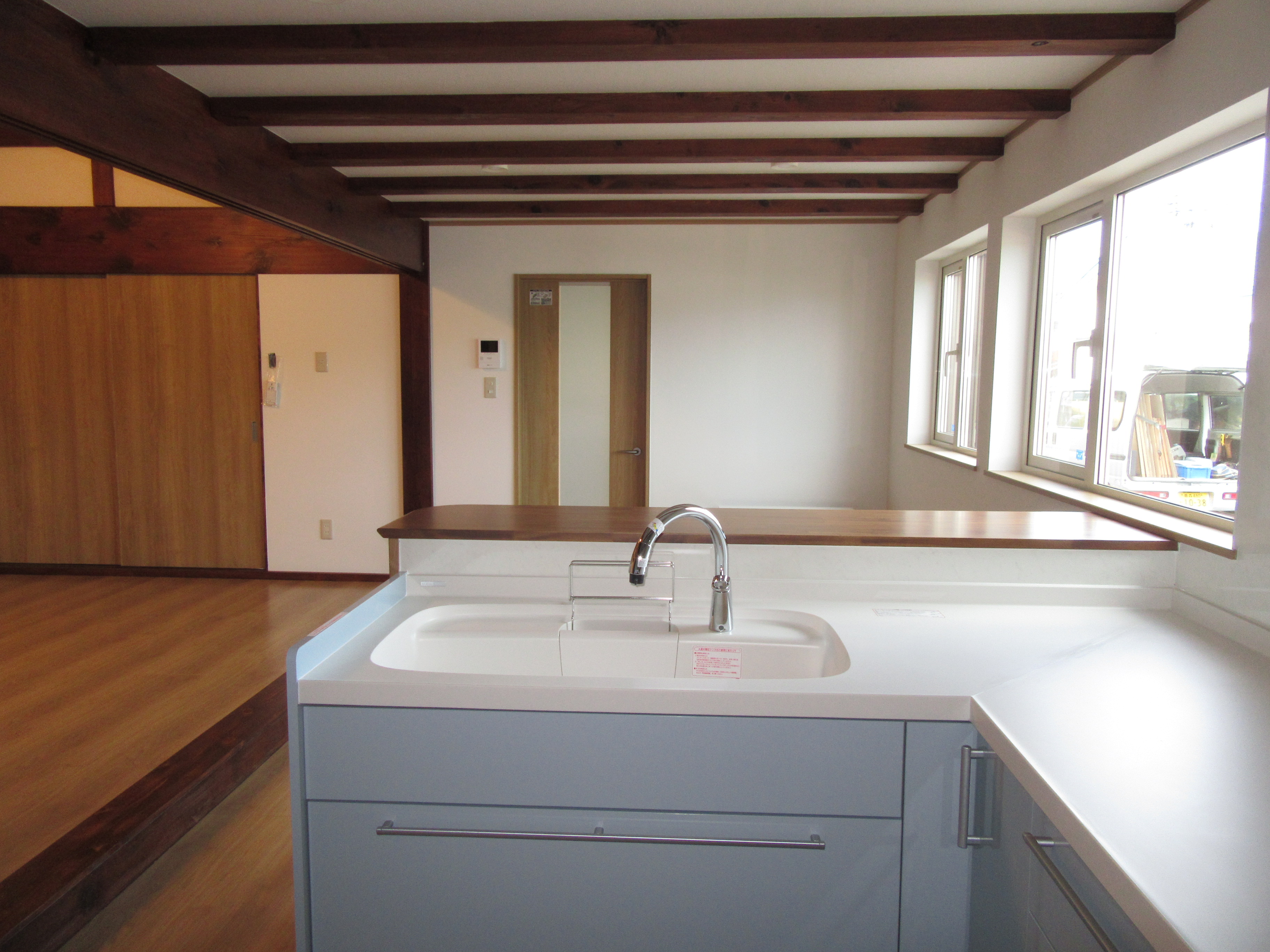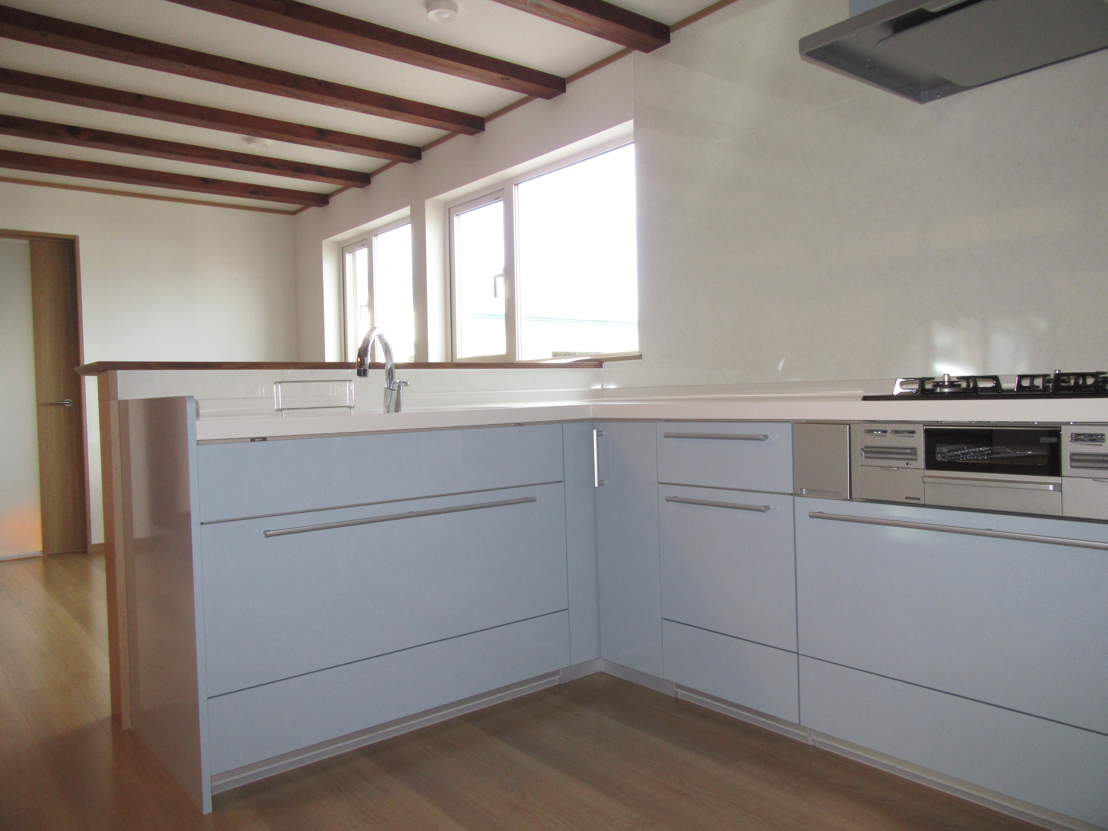 キッチン・ダイニング。リビングとつながっています。ダイニング側の窓からたくさんの光が入るので朝食・昼食の時間は爽やかな光を浴びながら明るく食事をすることが出来ます。シンク前のカウンターは広めになっているので配膳・下膳も楽にすることができます。