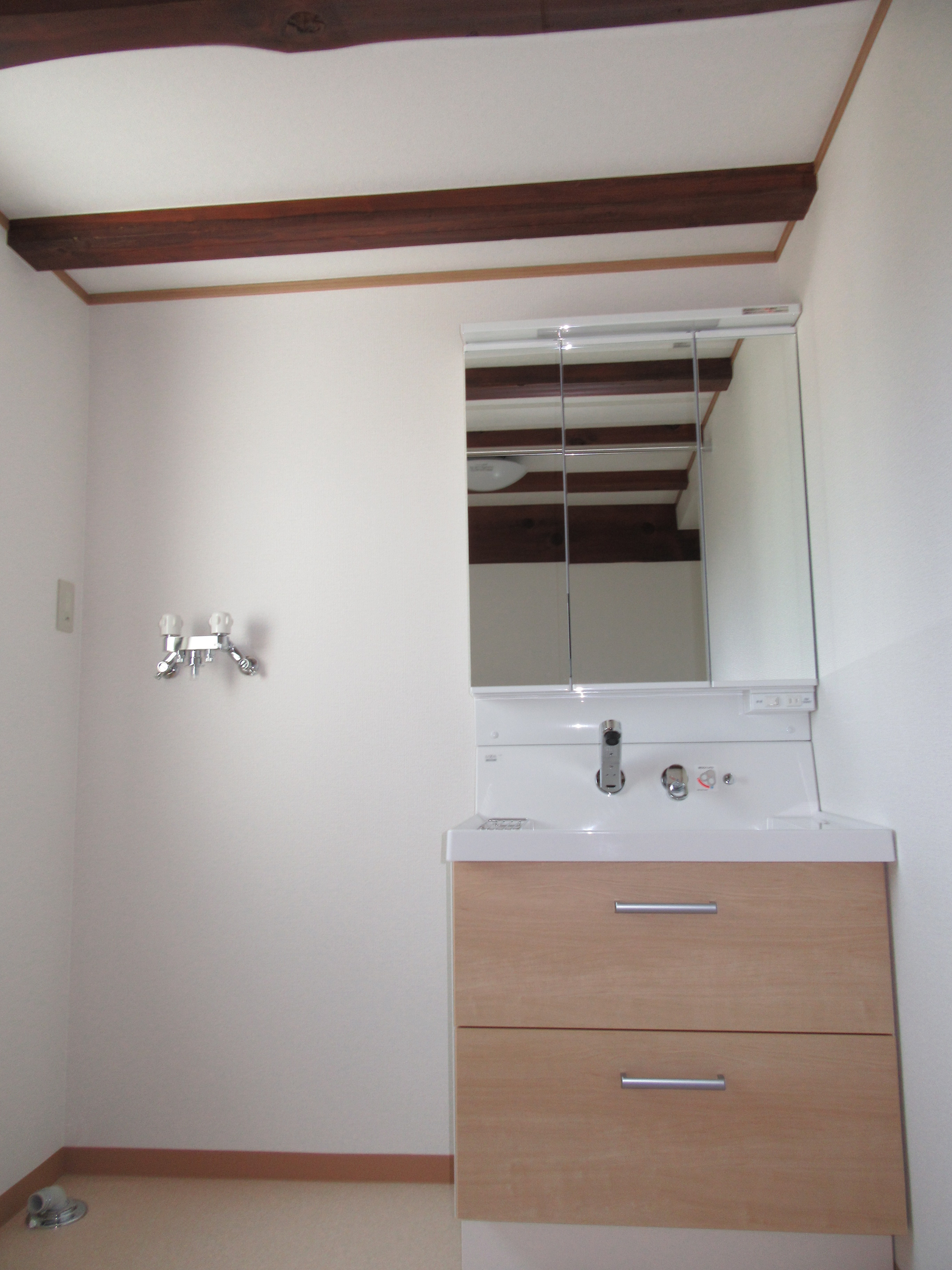 木目調の洗面化粧台。こちらの洗面化粧台は洗面器部分が大きくつけ置き洗いなどの家事でも活躍。ミラーは3面鏡で鏡裏には便利な収納。引出しもスライドタイプなのでご家族が多くてもたくさんの物を収納することが出来ます。