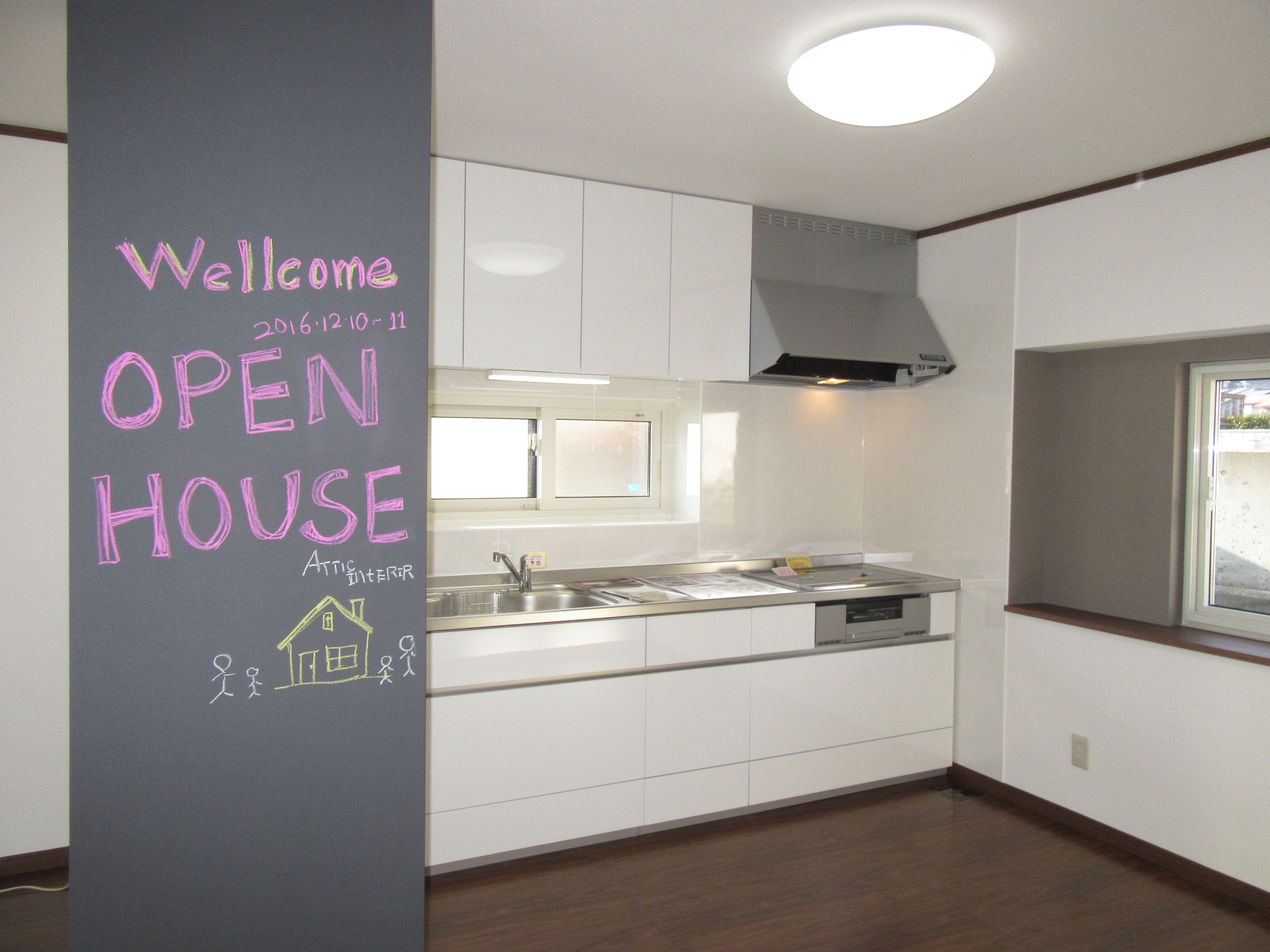 元々引戸で仕切られていたキッチンとリビングを繋げてLDKに。床は木目の幅広フロアを採用しナチュラルかつ重厚感のある空間に生まれ変わりました。濃いクロスを貼っている柱には、チョークで絵や文字を描ける黒板クロスを採用。家族のコミュニケーションボードとしてや、お子様のラクガキスペースとしても使うことが出来ます。