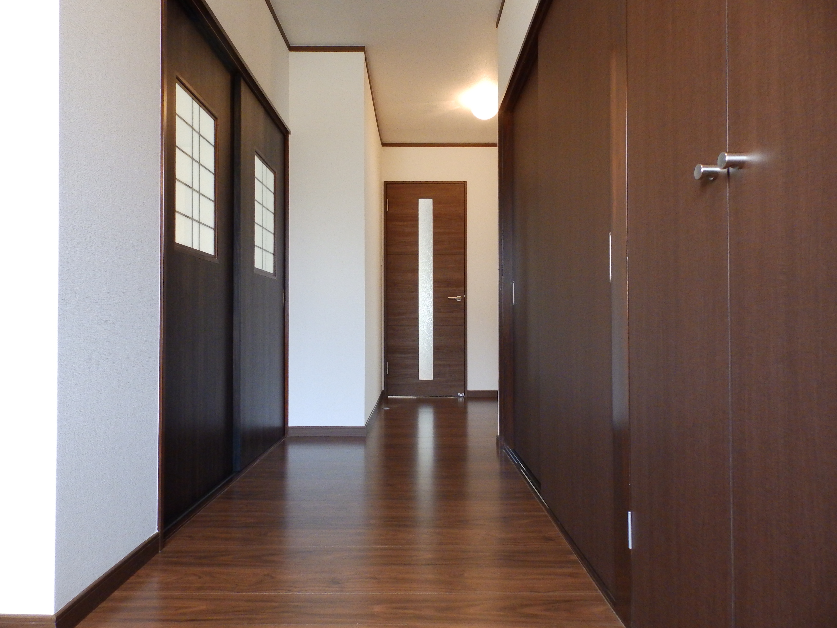 各お部屋へとつながるホール。天井、床、壁を張り替えました。また、建具も既存のものにシートを貼りなおすことで新品同様の仕上りに。真っ白の壁に濃い色の木目が引き立ちます。