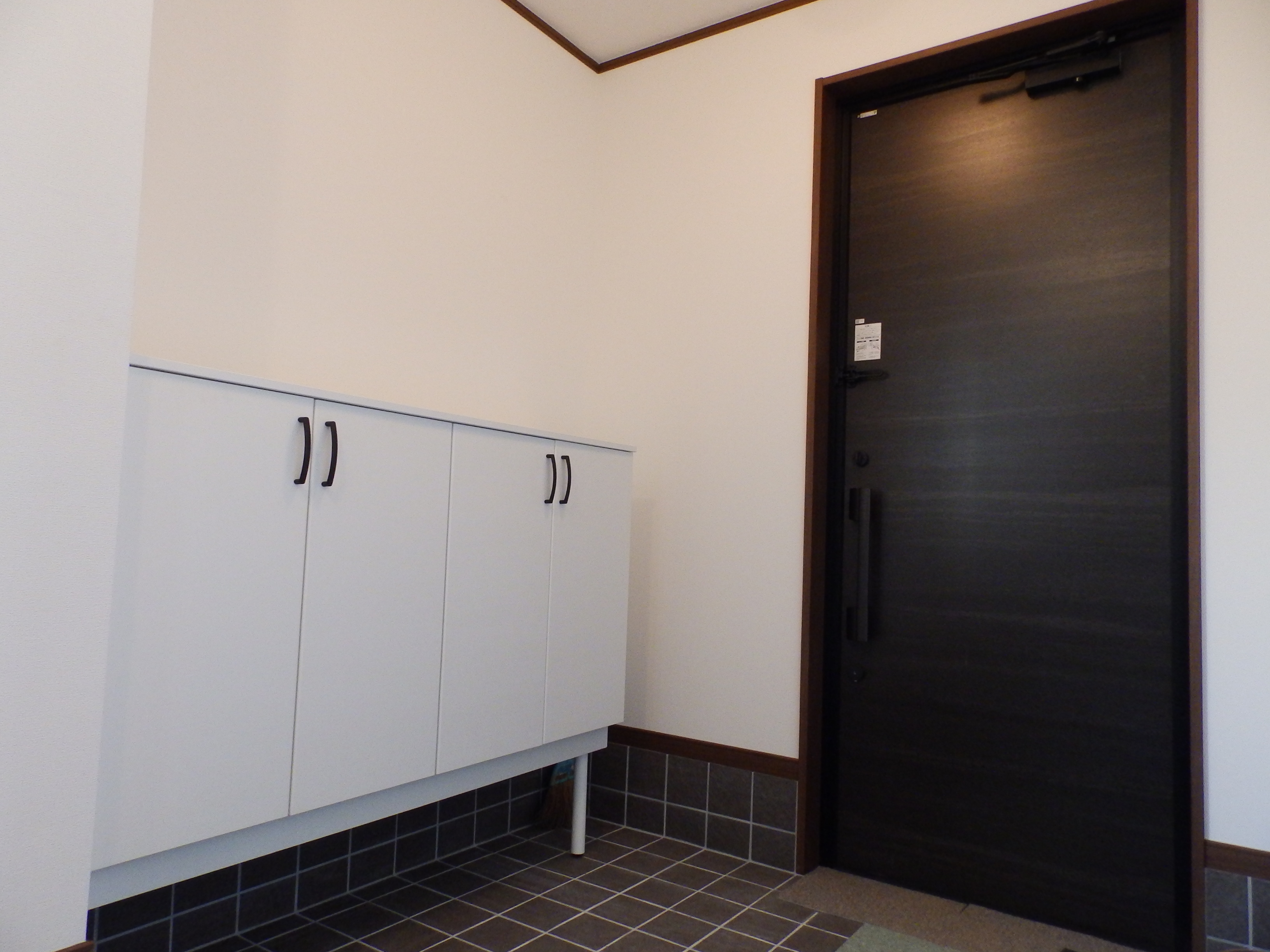 引戸からドアへとお取替え。断熱ドアを採用し玄関ホールの断熱性がアップしました。グレーのドアとタイルにあえて白のシューズボックスを採用したことで重くなりすぎず落ち着きと清潔感のある空間になりました。
