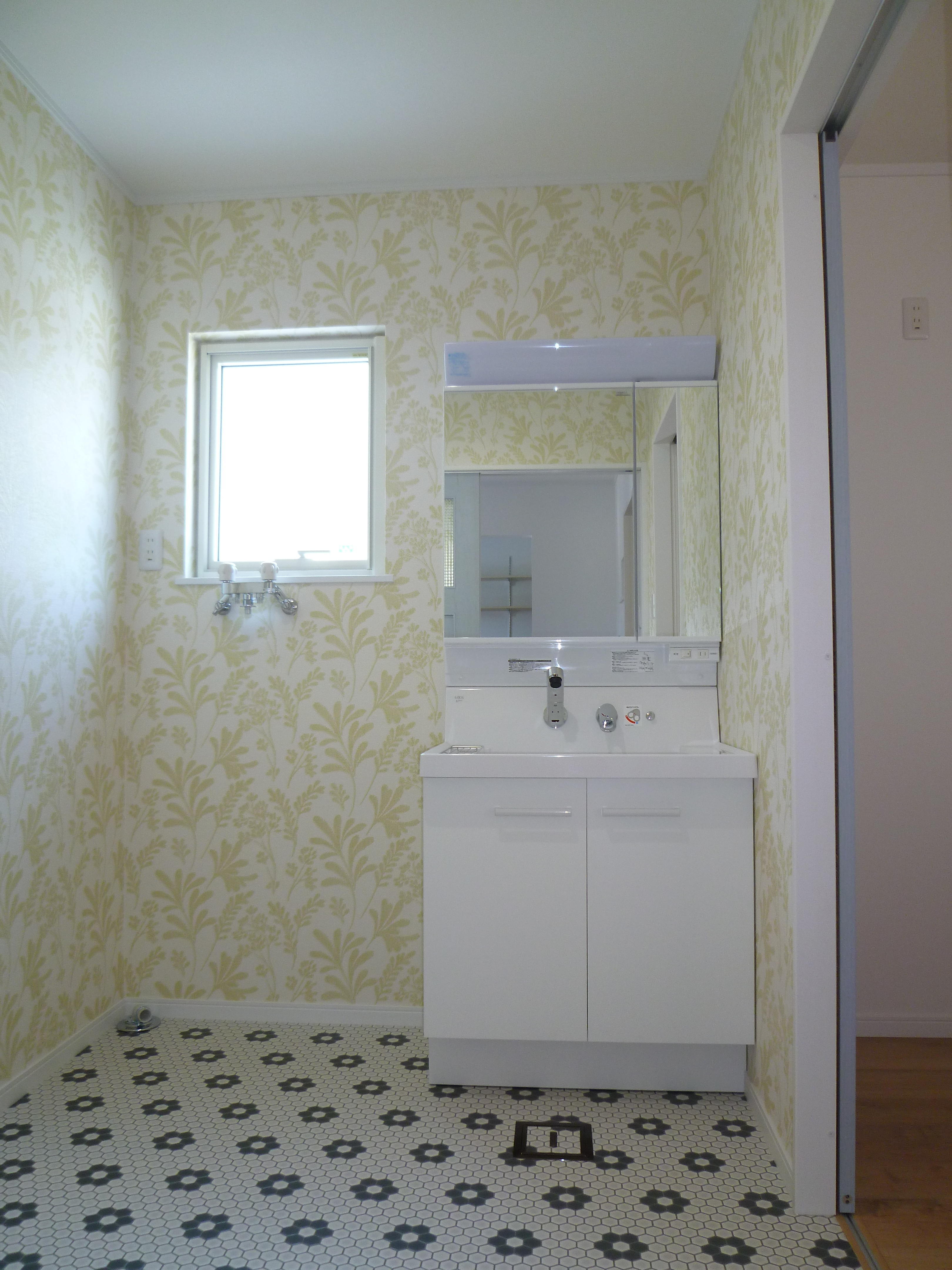 リビングからも、玄関からも出入りすることが出来る洗面室。コーディネートされた内装で毎日の家事も身支度も楽しくできそうです♪