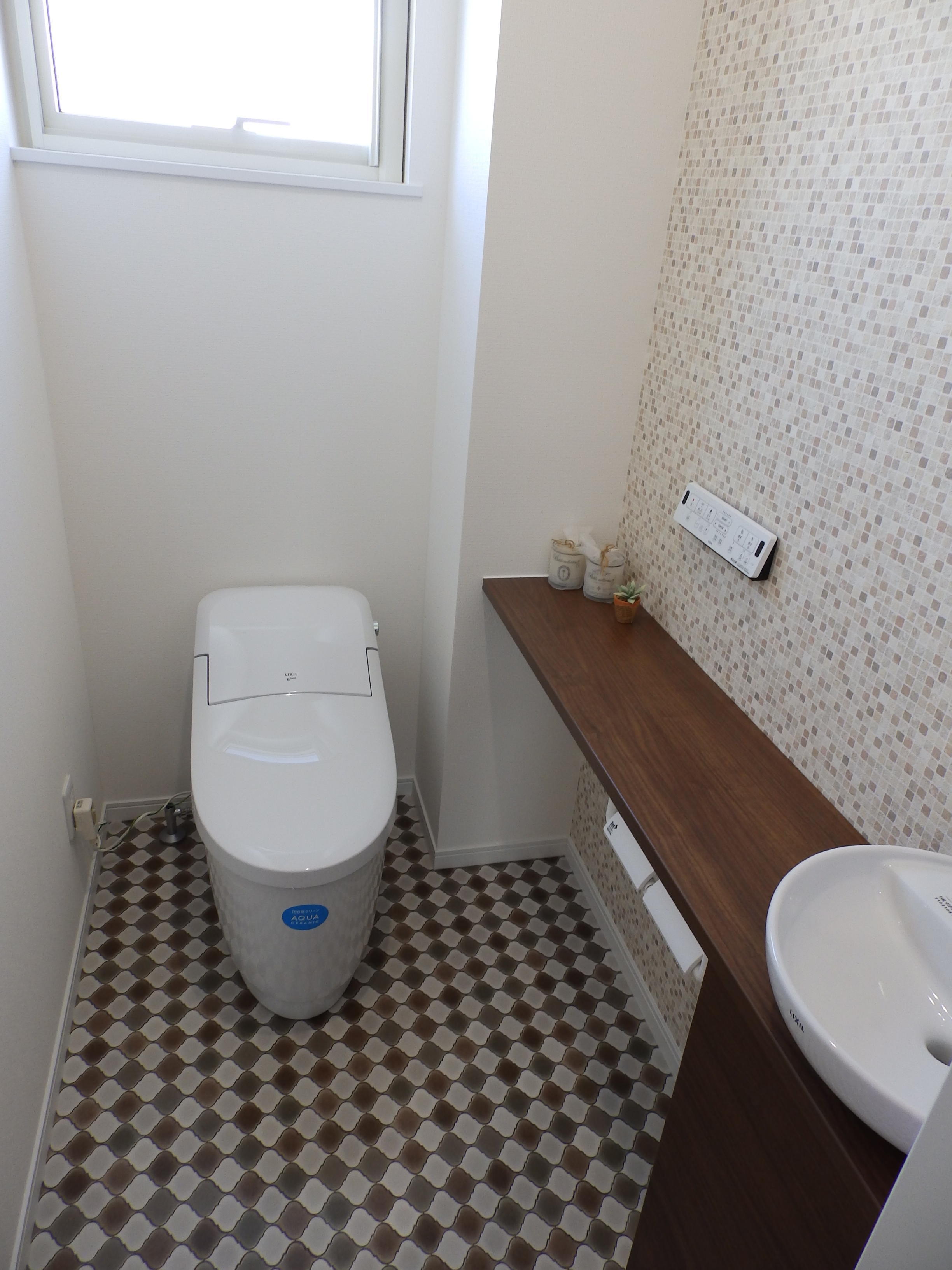1階のトイレには手洗付のカウンターも設置。モザイクタイル風のクロスで無機質になりがちなトイレ空間も明るく癒される空間になりました。