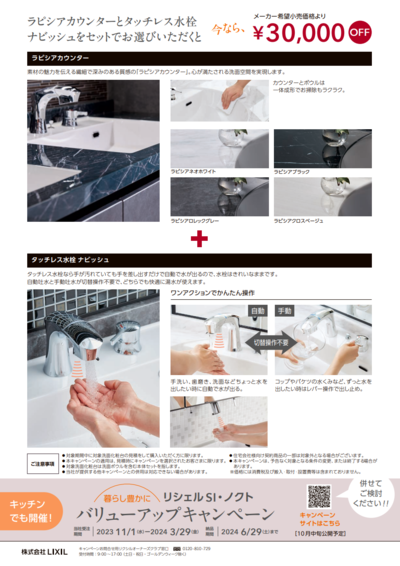 この度、LIXILの大人気商品『ルミシス』に「ラピシアカウンター」とタッチレス水栓「ナビッシュ」をセットすると、なんと30,000円オフとなるお得なバリューアップキャンペーンを実施します!