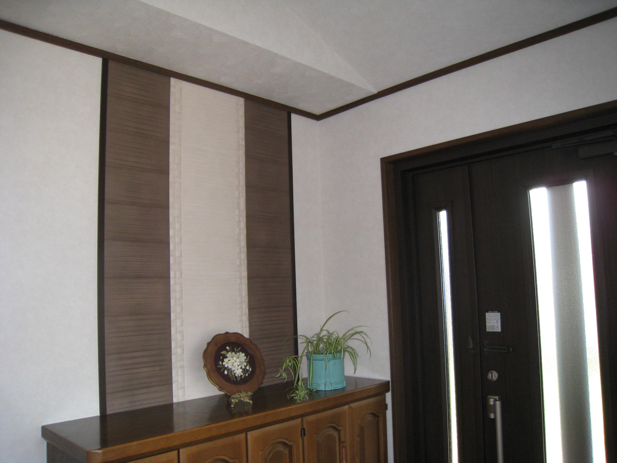 玄関内部もクロスを貼替、エコカラットをアクセント貼りしました。素敵な玄関でお客様をお迎えできます。