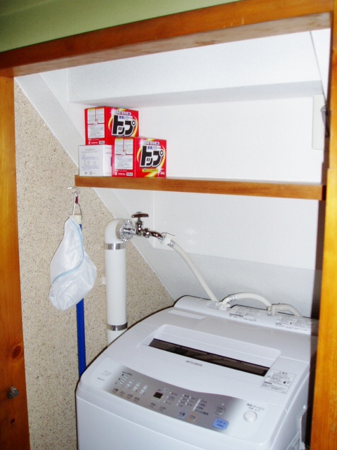 階段下の空きスペースを利用して洗濯機を置き、棚を作ることで洗剤などの小物もきれいに収納できるようになり、洗面所も広く使えるようになりました。