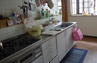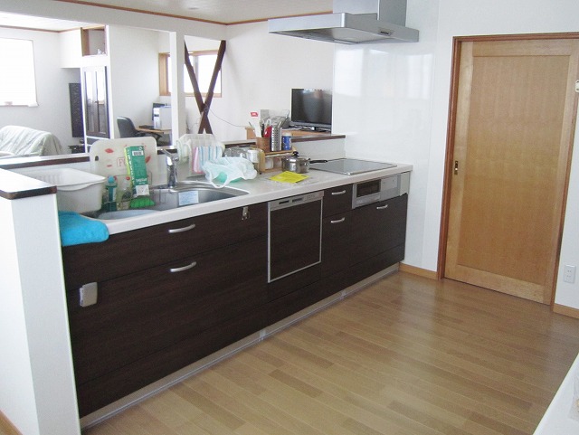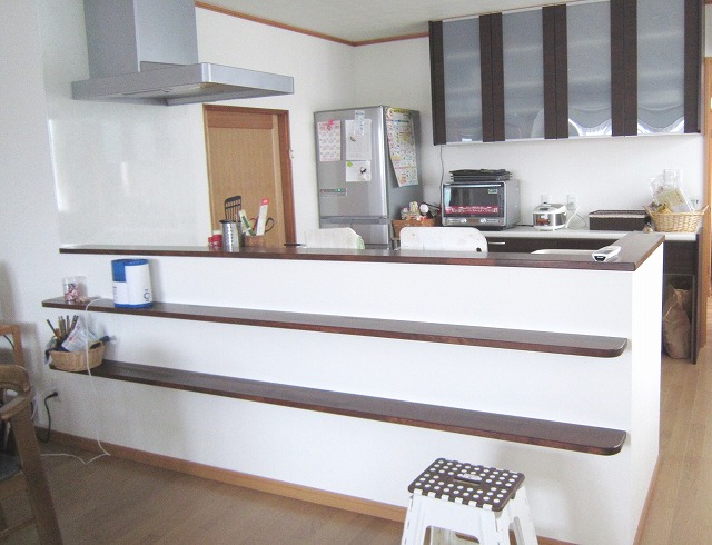 キッチン対面側に棚をつけることにより、収納、インテリアスペースとして活用でき、スツールを置いてカウンターを利用することによりカフェのような憩いの空間に仕上がりました。
