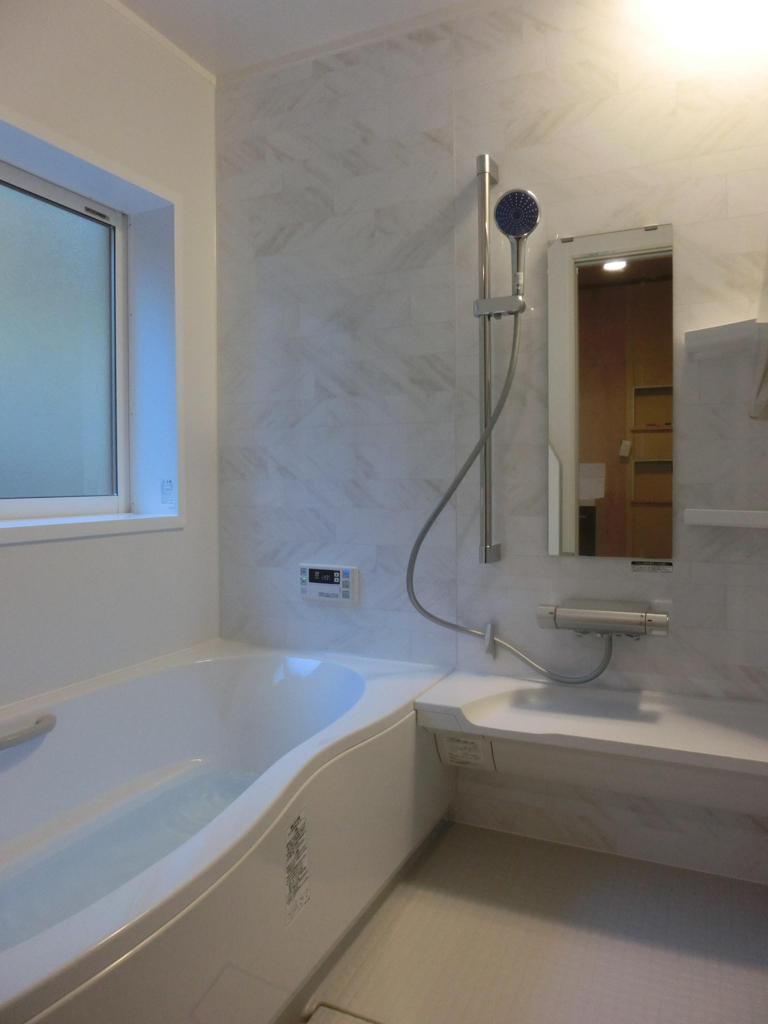 建物がメーターモジュールということもあり、本来ユニットバスは1.5坪を入れれたのですが予算の都合もあり1坪タイプを入れさせていただき残りの空間は断熱施工に回して埋めるやり方で施工いたしました。浴室・洗面所ともに断熱に気を使い断熱サッシへの変更を勧めさせて頂きました。工事の際はご協力いただきまことにありがとうございました。