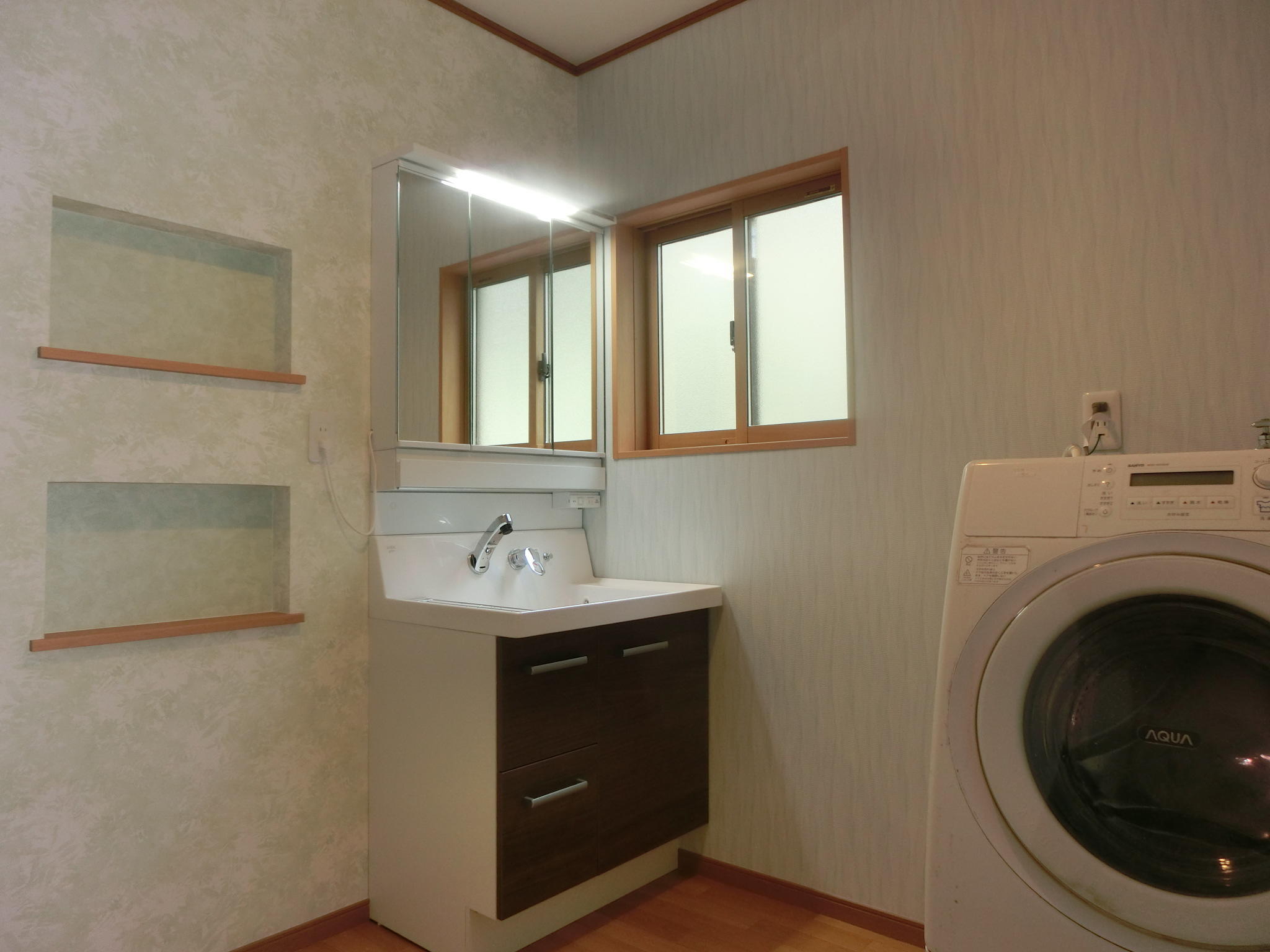浴室改修に伴い、洗面所もリフォームを。明るい雰囲気に変えたいということで壁紙などにも気を配って選ばせて頂きました。収納も気にされていたので、新規キャビネット以外にも小棚として壁面にニッチも施工させて頂きました。
