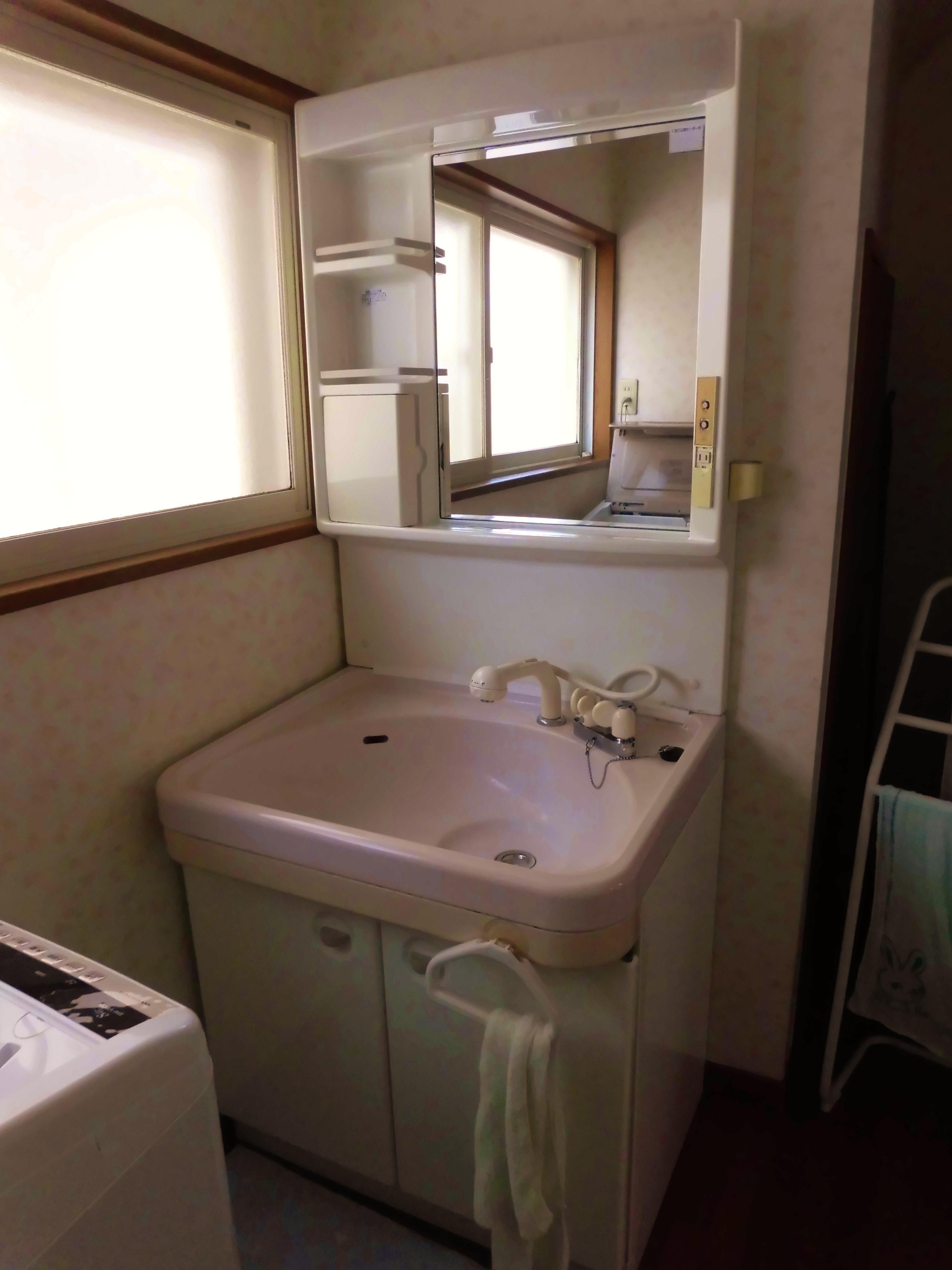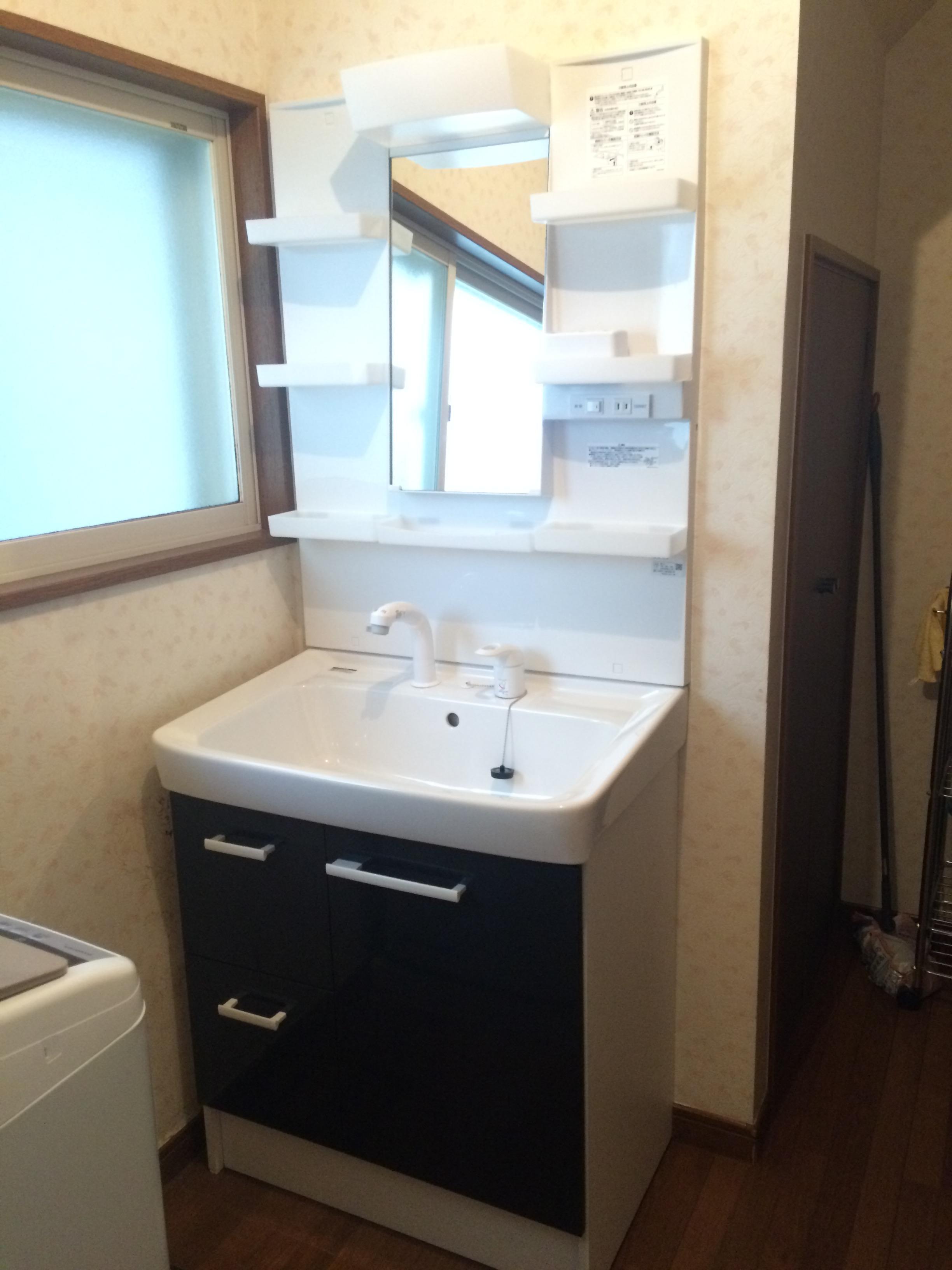 長年の使用で特に洗面器部分の蓄積汚れが気になり始めた、ということでご来店下さいました。今までお使いになっていた洗面器と同じ陶器のもので、というご希望からLIXILの「オフト」をご提案させていただきました。以前よりも奥行きが短くなったため立ちスペースが広くなり洗面室が広々使えます。別に取り付けていたタオル掛けも、新しい化粧台は扉の取っ手部分がタオル掛けになっているので邪魔にならず便利です!