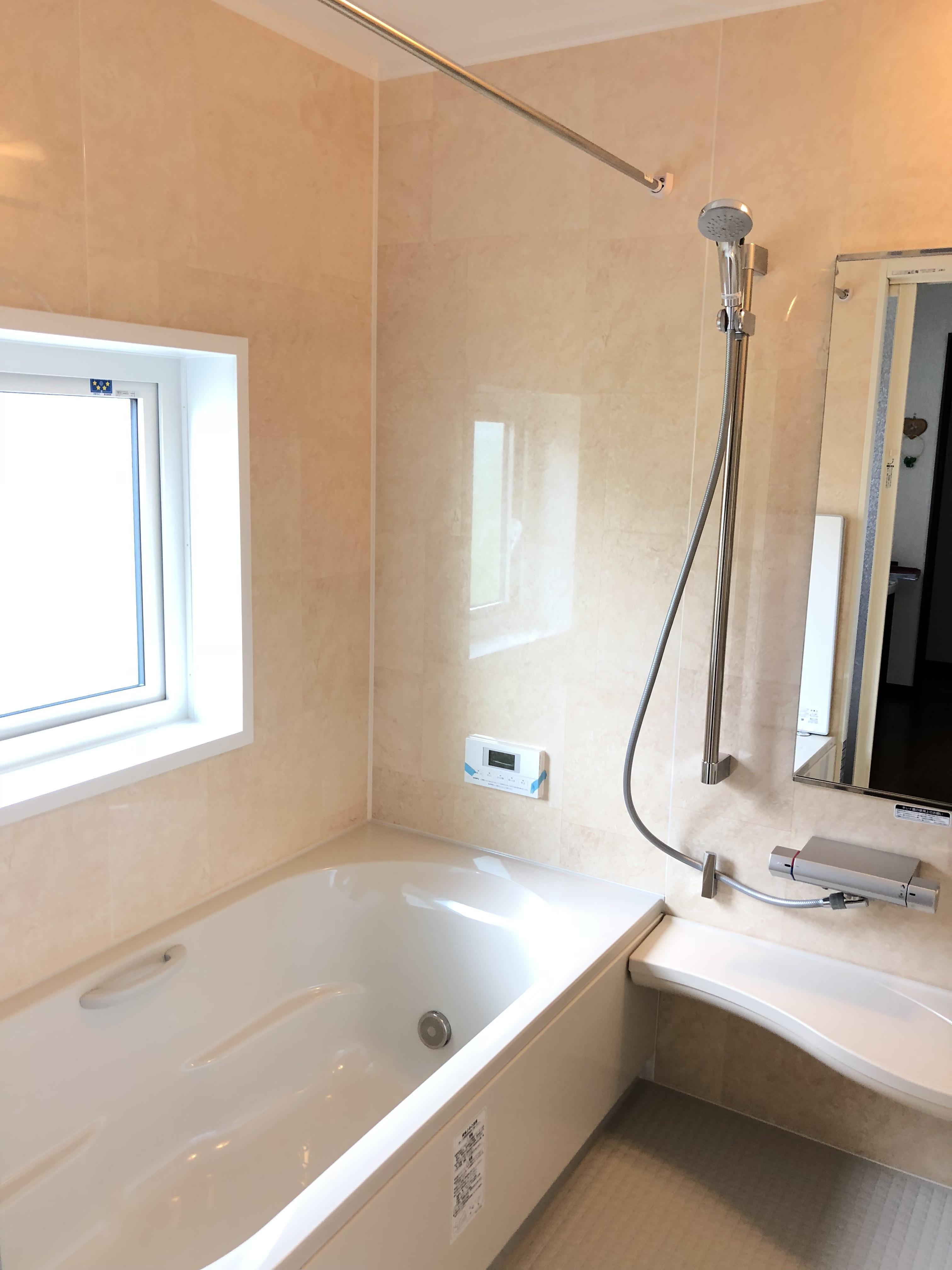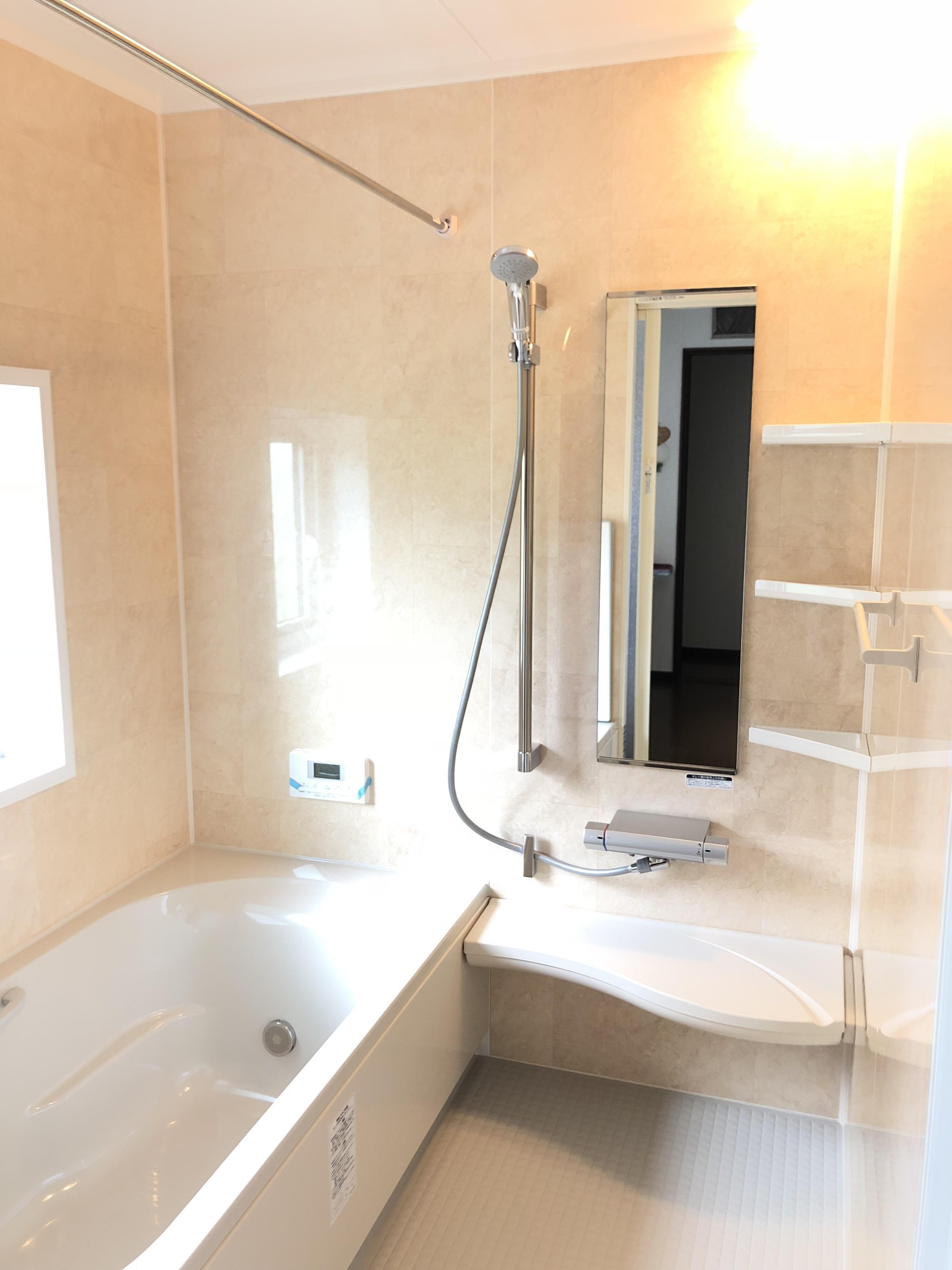 タイル張りのヒヤッと寒い浴室で、経年から汚れも目立ってきたということからご相談いただきました。浴室を解体し、LIXILのユニットバス「アライズ」へ。床はヒヤッとしない汚れにくい「サーモフロア」、浴槽は保温構造でお湯が冷めにくい「サーモバス」にしたことで断熱性アップで室内全体がポカポカです。泡が飛び散り汚れてしまいがちな壁面は、4面とも鏡面仕上げにし、またカラーも纏めたオレンジ色があたたかな印象にさせてくれました。洗面所と浴室との段差も解消し、バリアフリー化でつまづく心配もありません。