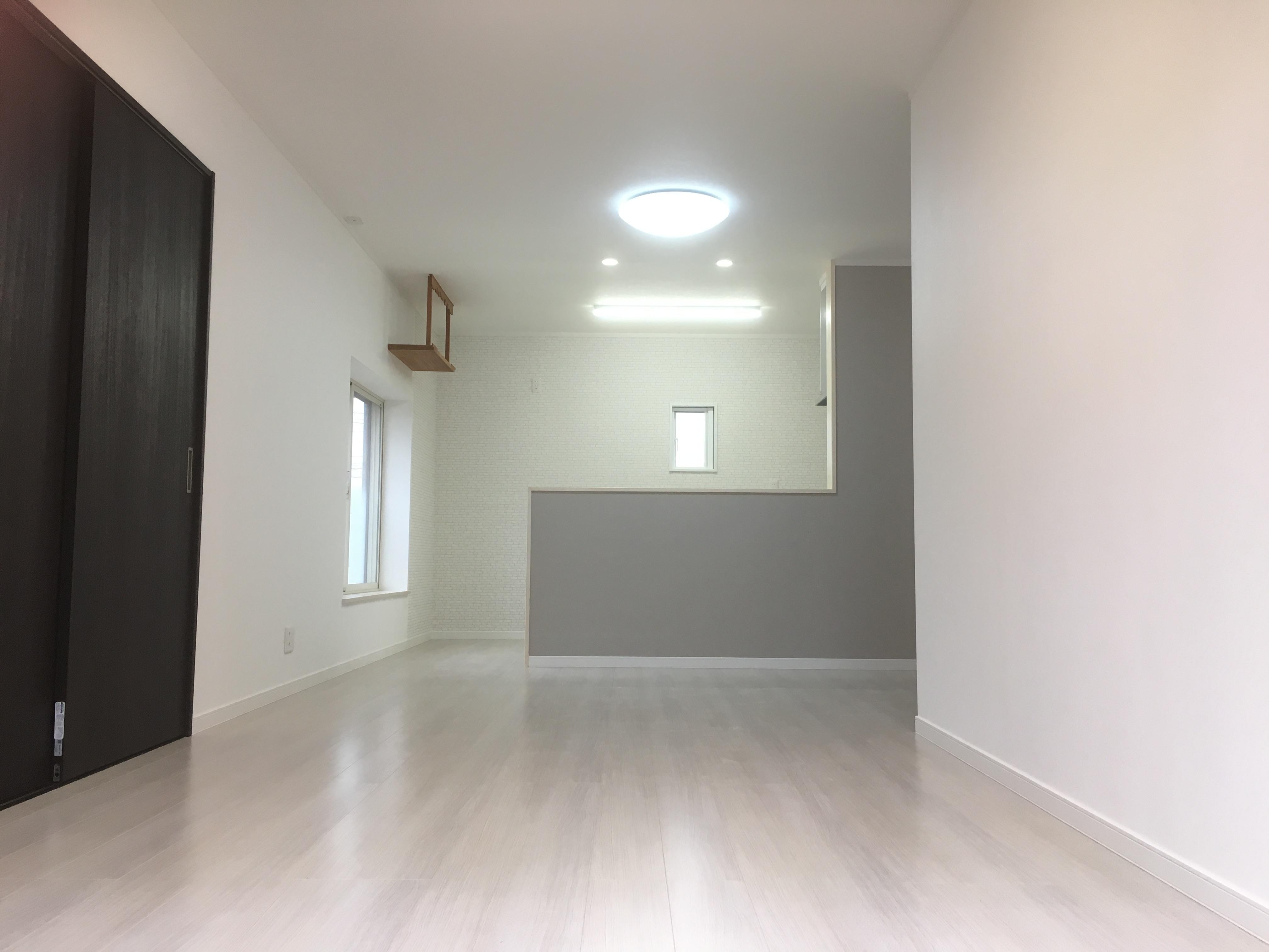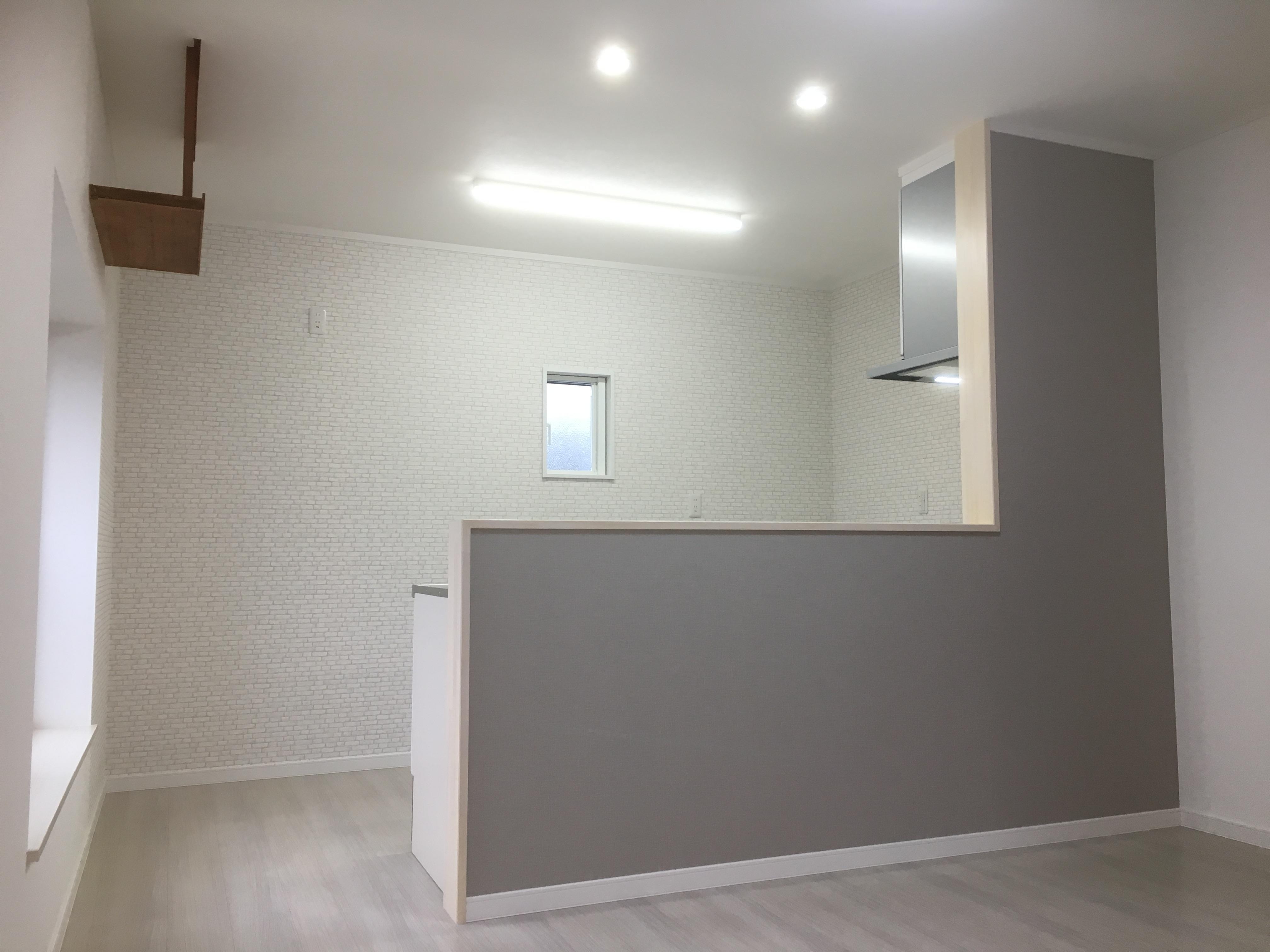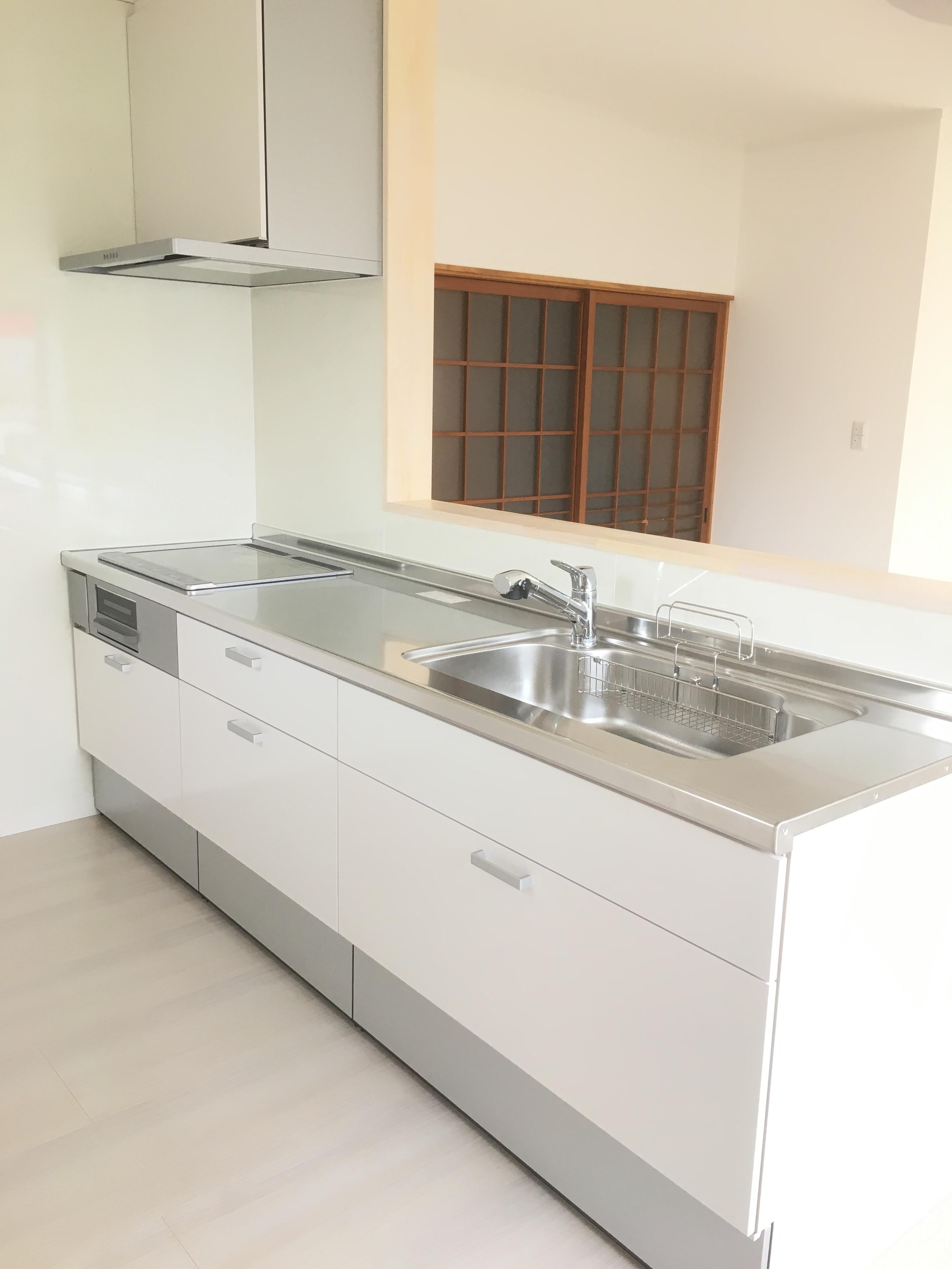 和室2部屋を広い1部屋のリビングキッチンにして、使い勝手のいい明るい空間にしたいということから相談会にいらっしゃいました。部屋の間仕切りをなくしただけで奥まで光が入るようになり、また床材やクロスを白を基調にしたことで以前よりもグッと空間が明るくなりました!全体の白いクロスを邪魔せず、空間を引き立てるアクセントクロスは奥様のチョイス!合わせた白のキッチンと相性がバツグンです!キッチンは収納力・使い勝手どちらを取っても◎。家族の皆さんが自然と集まりたくなる空間に変身しました!