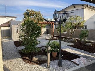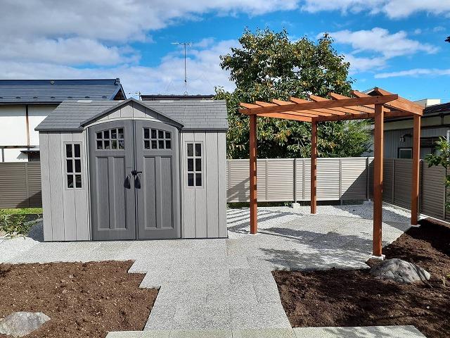 石畳敷きの庭には、合間に残した植栽を配置、奥にはガーデニング用品用のおしゃれな物置と木製のパーゴラを設置しました。