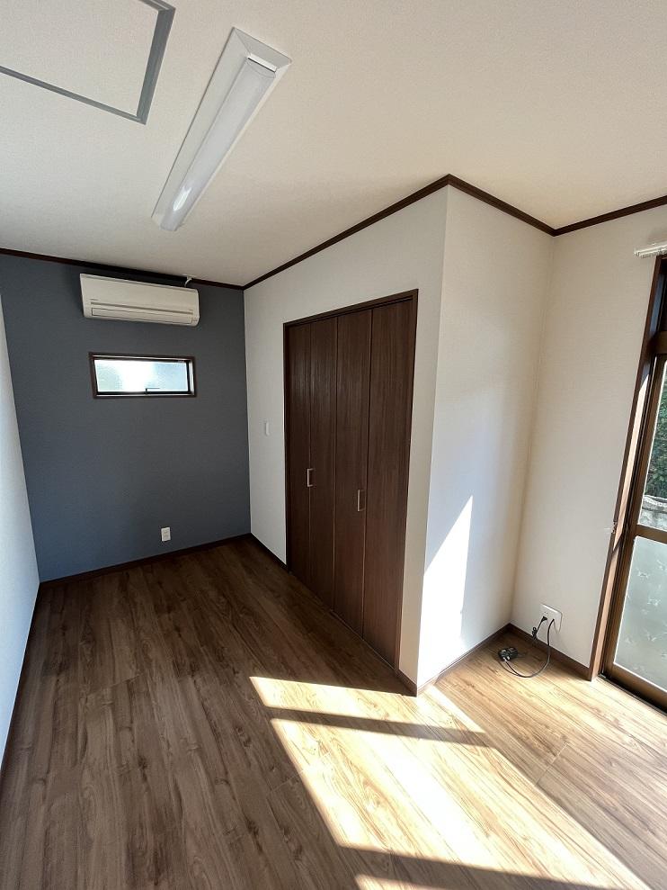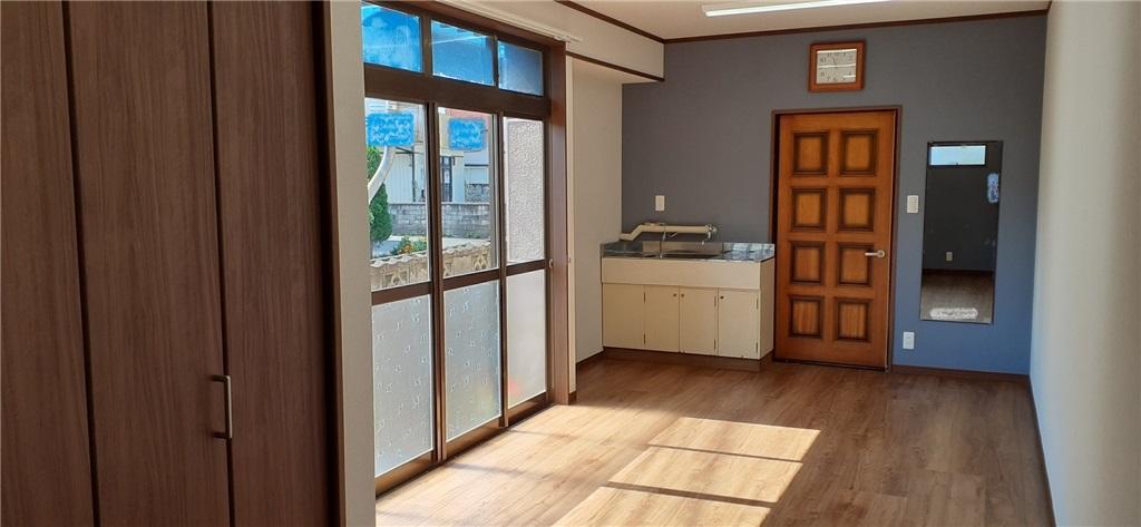 東、南面ともガラス面が多い店舗は、居住用に開口部を減らし、また、南面の掃き出し窓には内窓をプラスし断熱仕様にしました。店舗出入り口だった欠けの部分はクローゼットで目隠ししました。長年自宅と店舗を行き来したドアと鏡、流し台は再利用。
