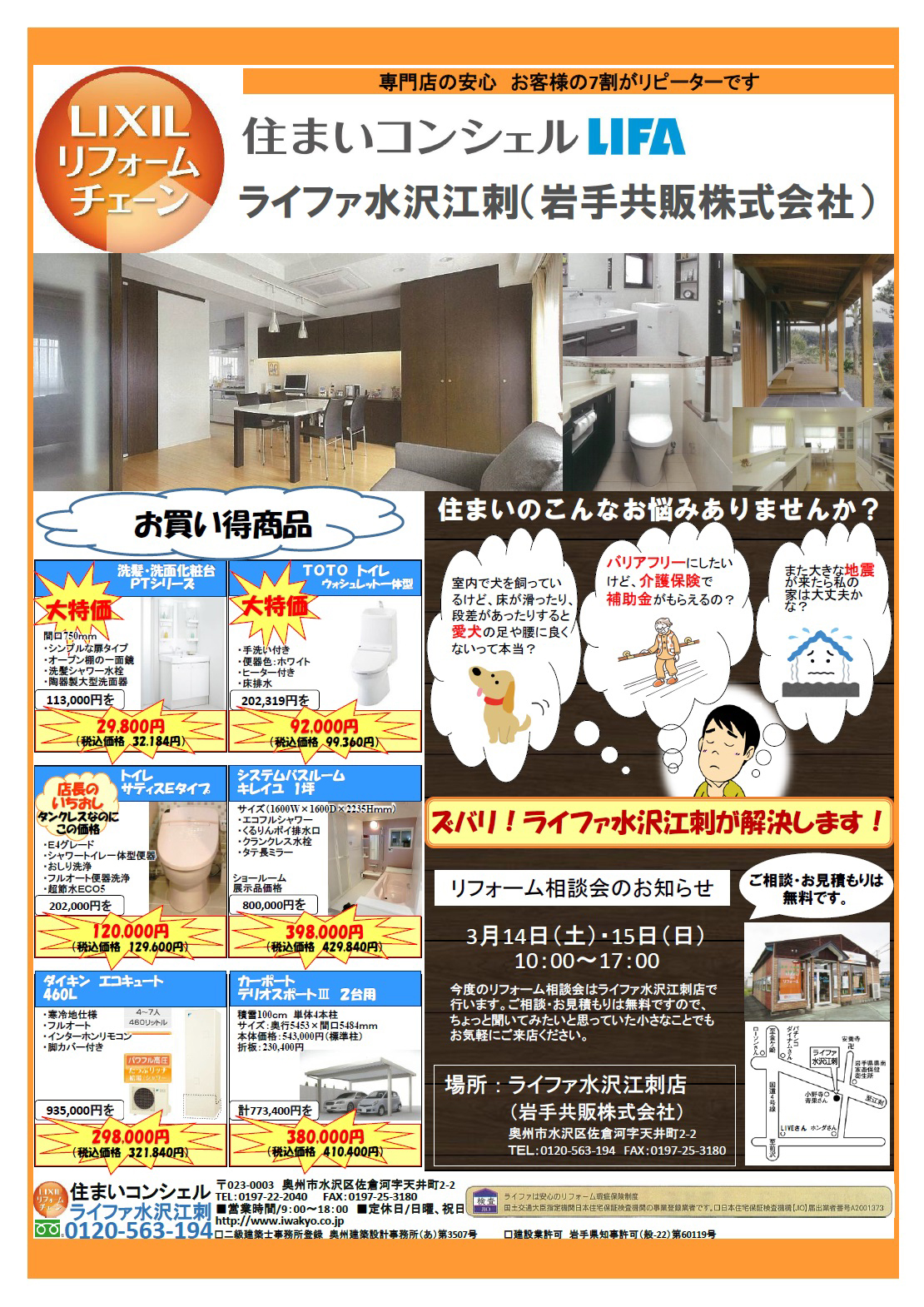 3月14日(土)、3月15日(日)にライファ水沢江刺店で相談会を開催します。
