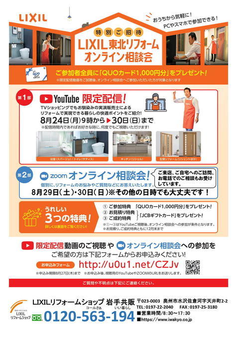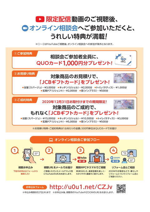 YouTubeの限定配信で浴室(スパージュ)、トイレ(サティス)、キッチン(リシェル)、玄関リフォームの動画をご覧頂き、相談会にご参加いただくと「QUOカード1,000円分」がもらえます!