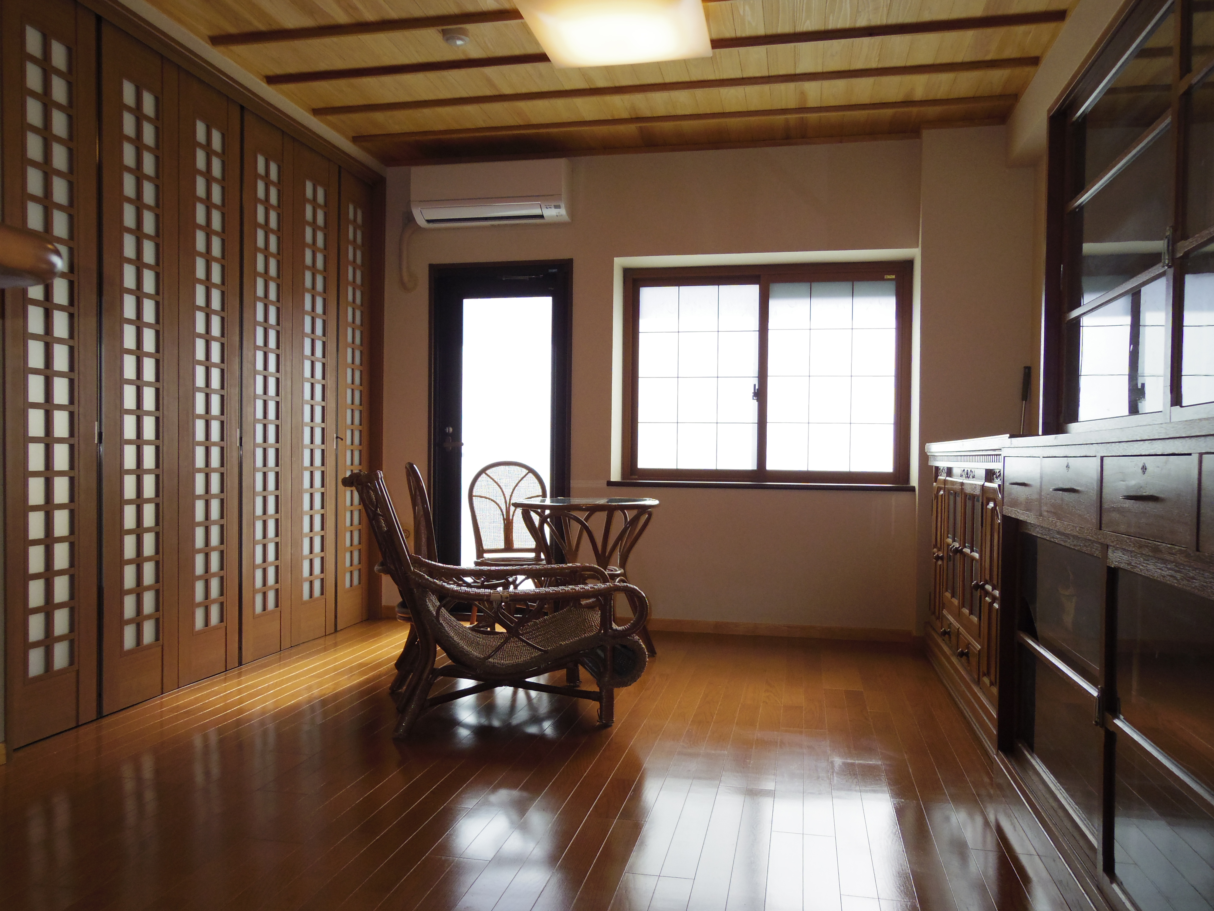 落ち着いた雰囲気にしたいとのことで、天井に杉の無垢板を張り、床・壁・建具の色調をすべて揃えて統一感を演出