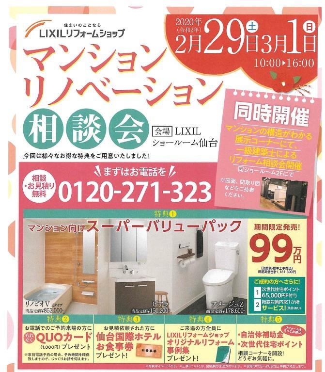 20年2月29日(土)3月1日(日)にLIXIL仙台ショールームにてマンションリノベーション相談会を開催致します。