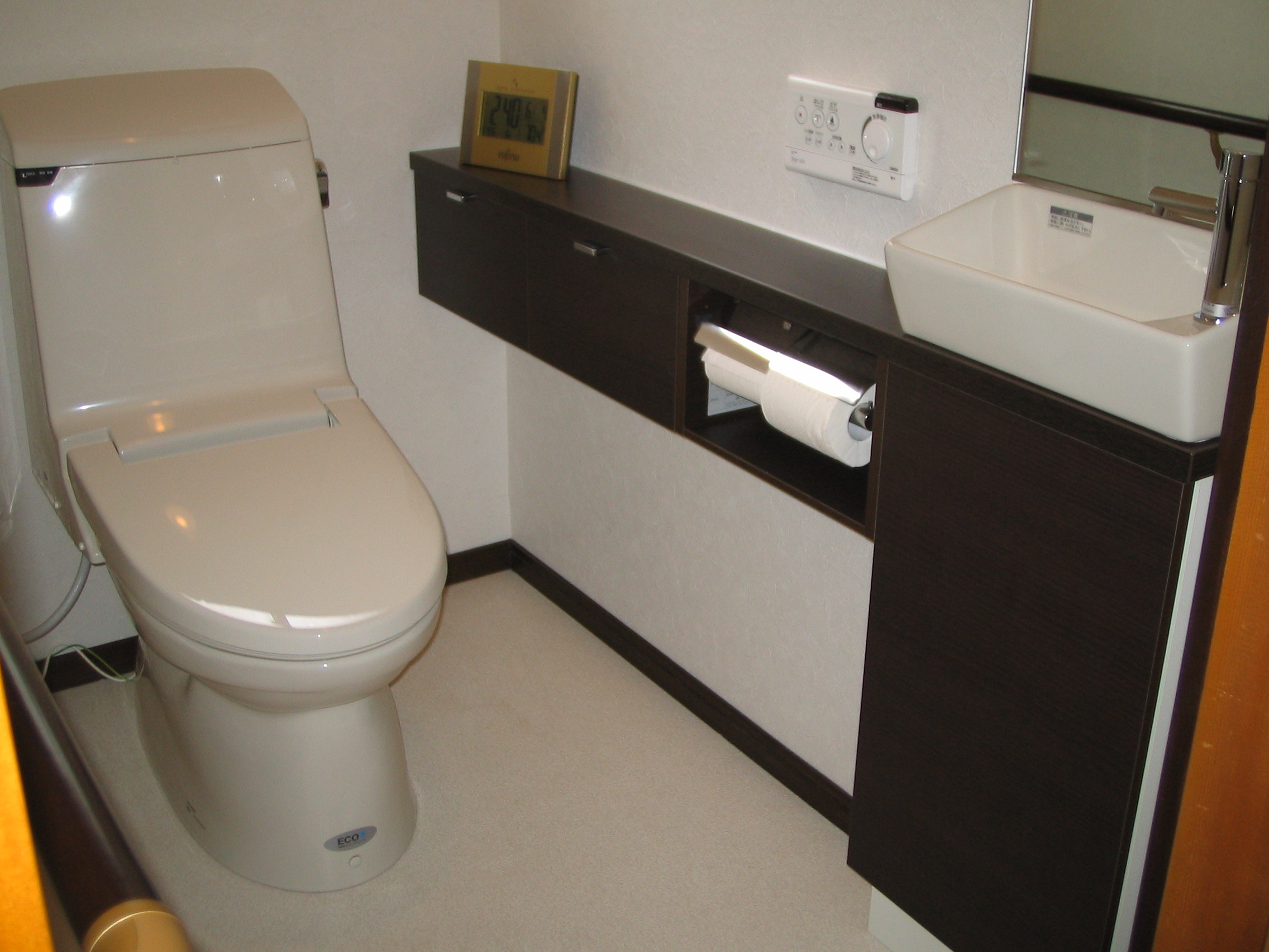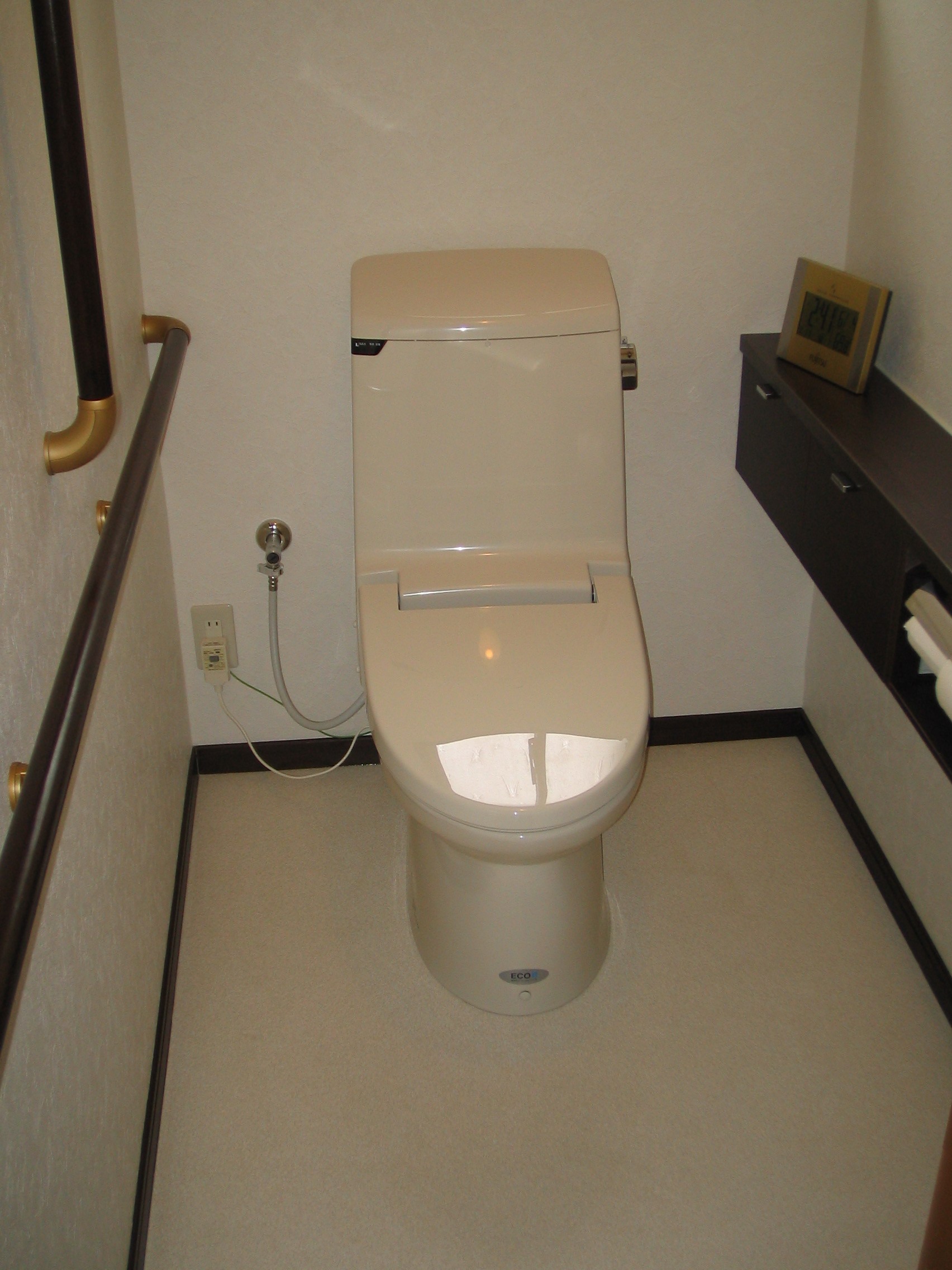下水への接続が1番の希望・接続にともなってお婆ちゃんが使いやすトイレにしたい、という要望のもと、床・壁は断熱改修をし冬場の寒さ対策を施したうえで、両サイドには手摺を設置しました。
