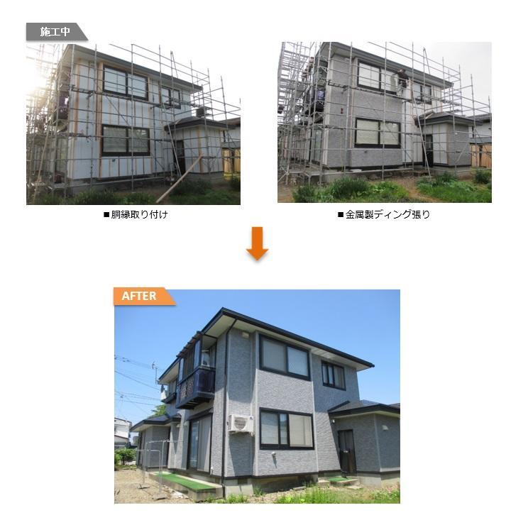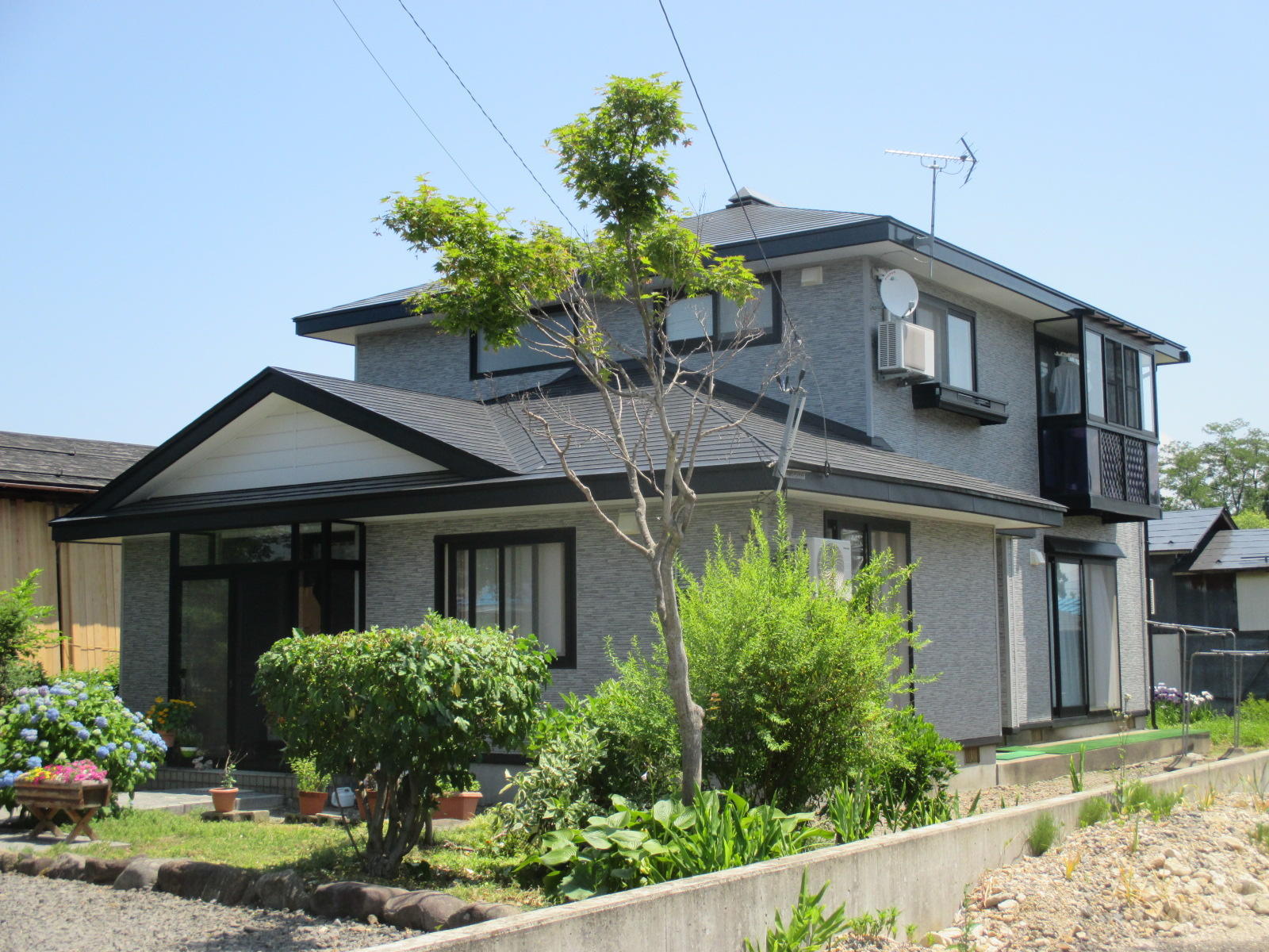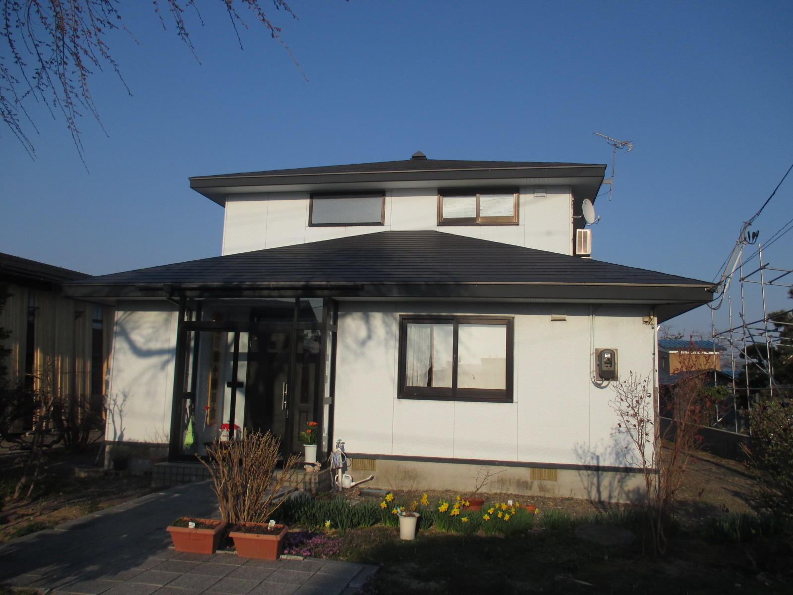 外壁の色褪せ、剥がれ等の劣化がありました。玄関前に落雪があり危険を感じておりました。玄関屋根は入母屋屋根に形状変更しました。