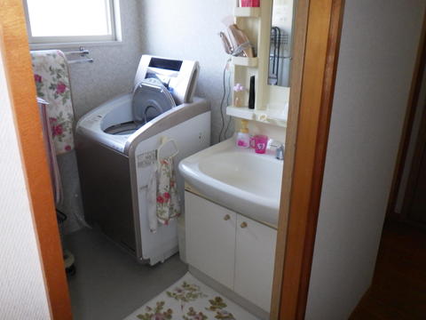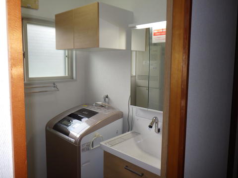 洗面化粧台の交換事例です。洗濯機上部にキャビネットを設置しました。