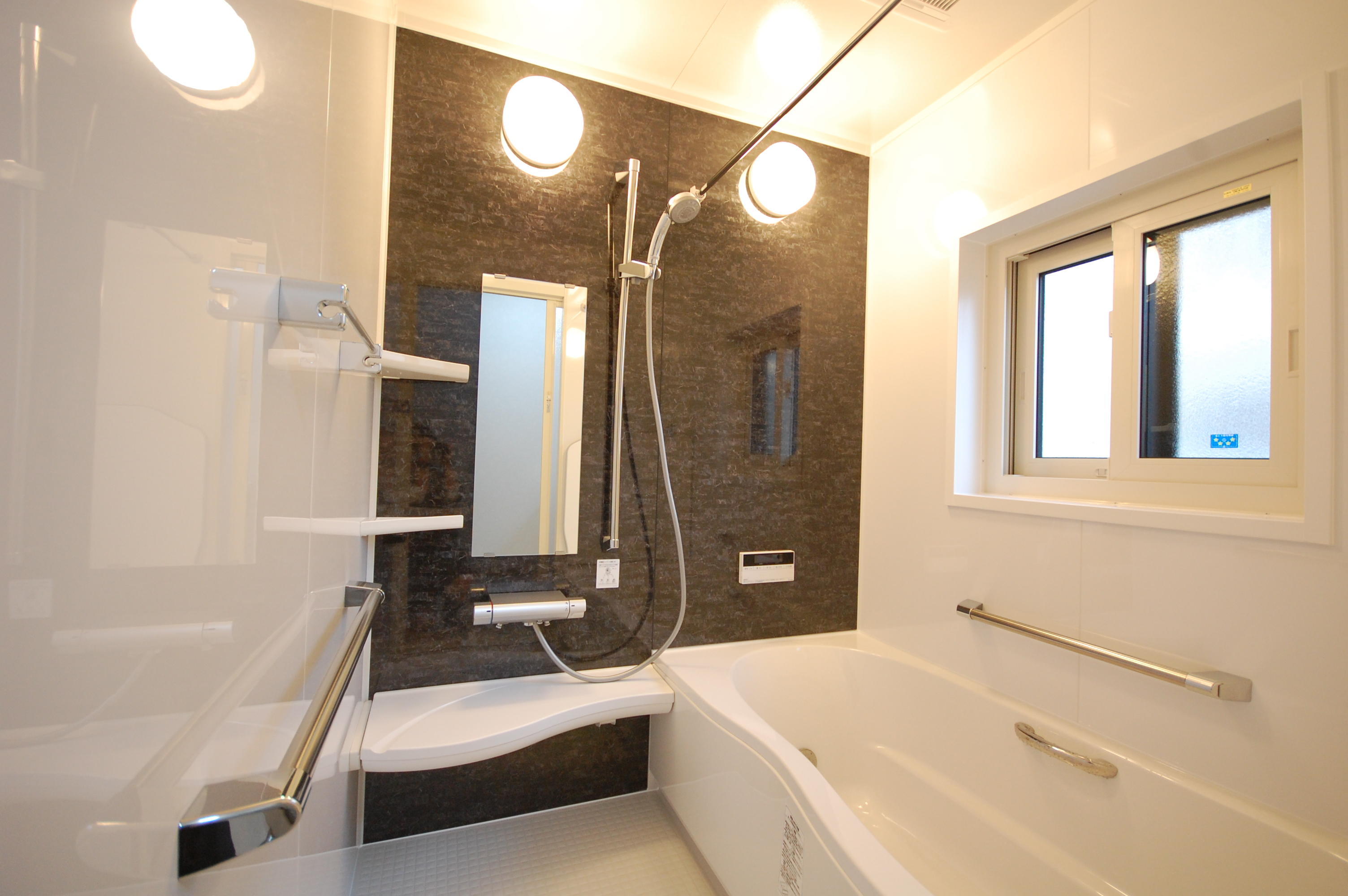 ユニットバス→ユニットバスへリフォームです。ストーンモザイクダークとホワイトの鏡面壁パネルはとても高級感がでて素敵ですよね。