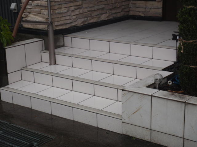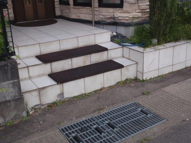 玄関ポーチリフォームのご紹介です。玄関ポーチでよく見かけるタイルの欠けや割れの修繕と高さのある階段を緩やかにし、手すりを取り付けしました。スッキリきれいに、安全に生まれ変わりました。