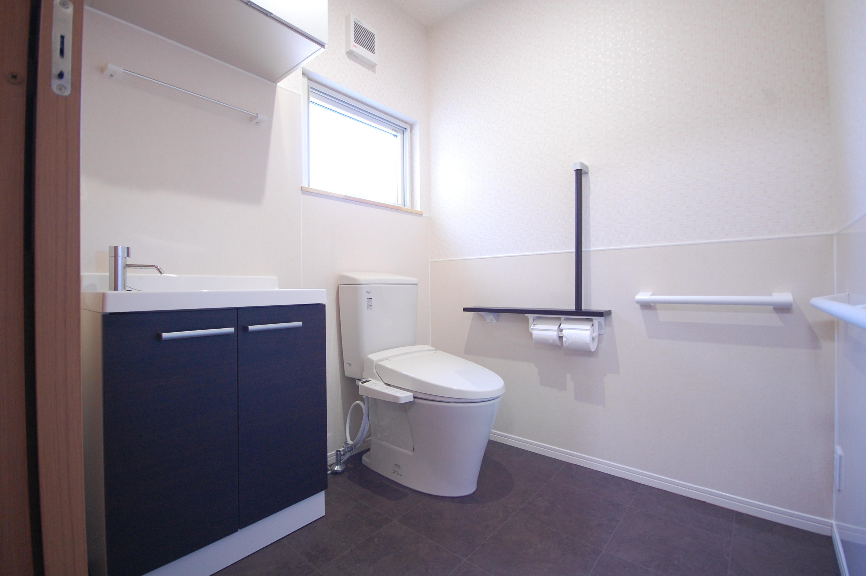 トイレリフォーム工事のご紹介です。和式便器と小便器、手洗いがそれぞれ独立していた為、小便器をなくしLIXIL「アメージュZ」洋式便器を取付しました。将来のことを考え、便器までの動線に手すりを3ケ所設置。また、床から高さ110cmの腰壁部分にトイレパネルを貼ることで掃除が楽になるように工夫しました。手洗いは下部収納が多いLIXIL「リフレ」を採用。使いやすさとお掃除楽ちん、おしゃれなトイレが完成しました。