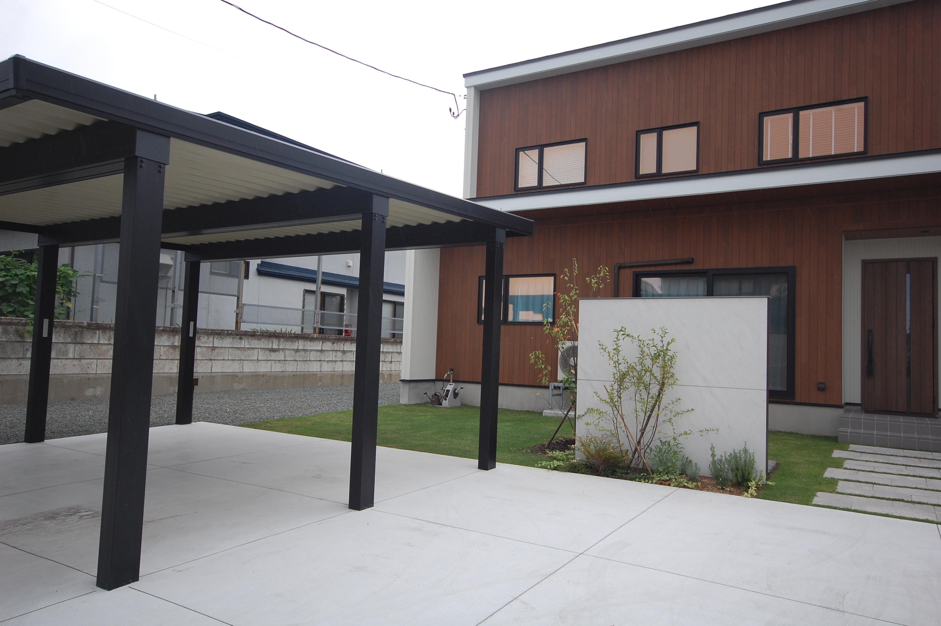 外構工事のご紹介です。リビングに大きな窓があるK様邸の庭には、LIXILが提案するエクステリアブランド「エクシオール」の「ウォールスクリーン」を設置しました。スクリーンを高くすることで目隠しにもなり、家の中からの目線が抜けすぎることなくプライベート空間をつくってくれます。また、植栽の背景としても効果を発揮し毎日の心地良い生活をサポートします。さらに、玄関前のアプローチにもこだわり、透水機能に優れ水たまりや泥はねを解消してくれる舗装材を敷きました。外構にこだわりをお持ちのお施主様も大満足のデザイン性溢れるモダンな外構となりました。