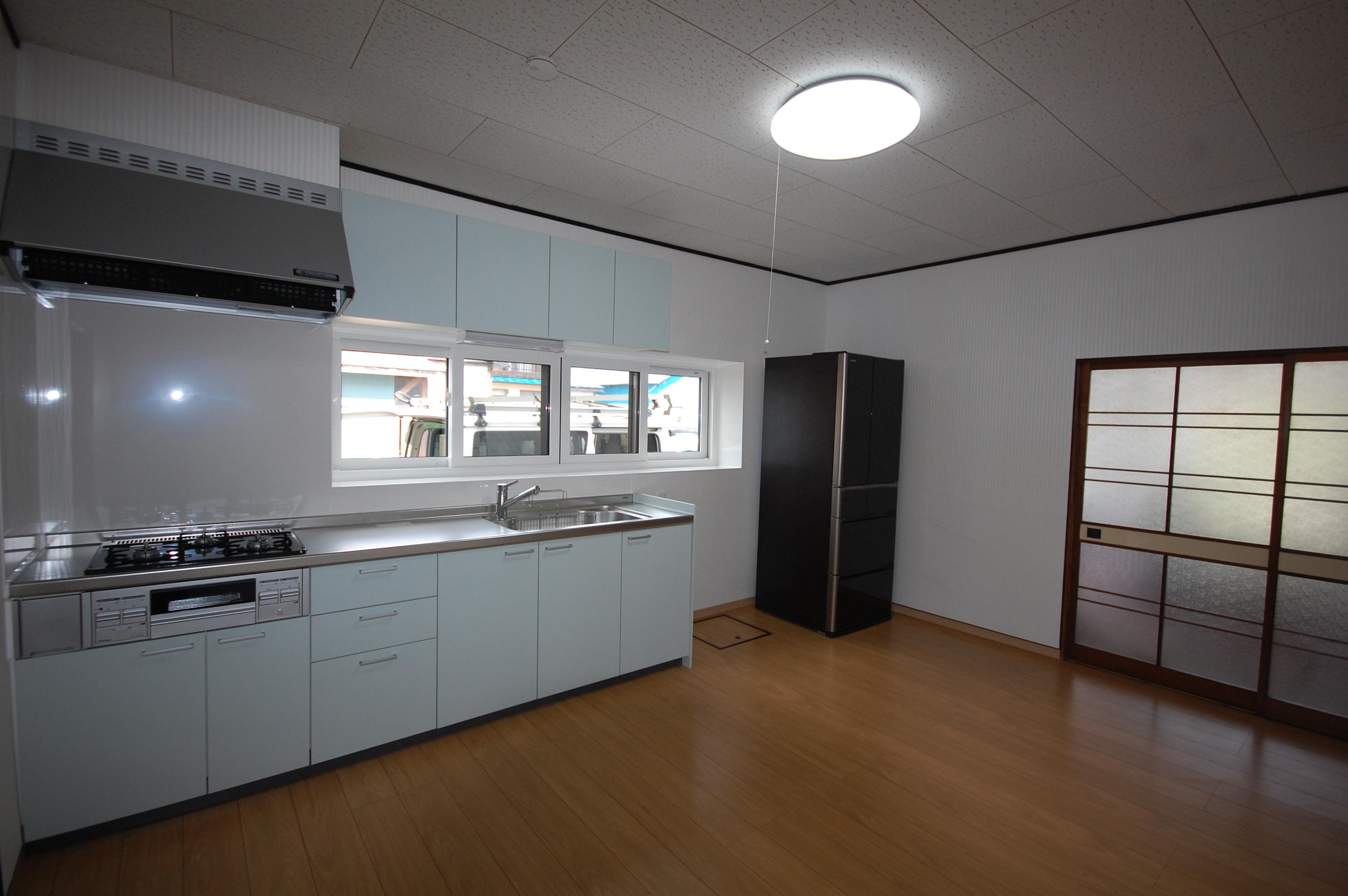 大規模リフォームのダイニングキッチン部分のご紹介です。以前よりもキッチンの幅を狭くしたことで、空いたスペースを冷蔵庫の設置や収納場所として利用できます。スキットシンクは水流の広がりを抑えて段差に流し込むナイアガラフロー方式となっているため、シンク内に汚れを広げずに洗い物ができます。キッチンの扉を爽やかなノールグリーン色にし、床フロアの貼替えをしたことで明るいダイニングキッチンが完成しました!