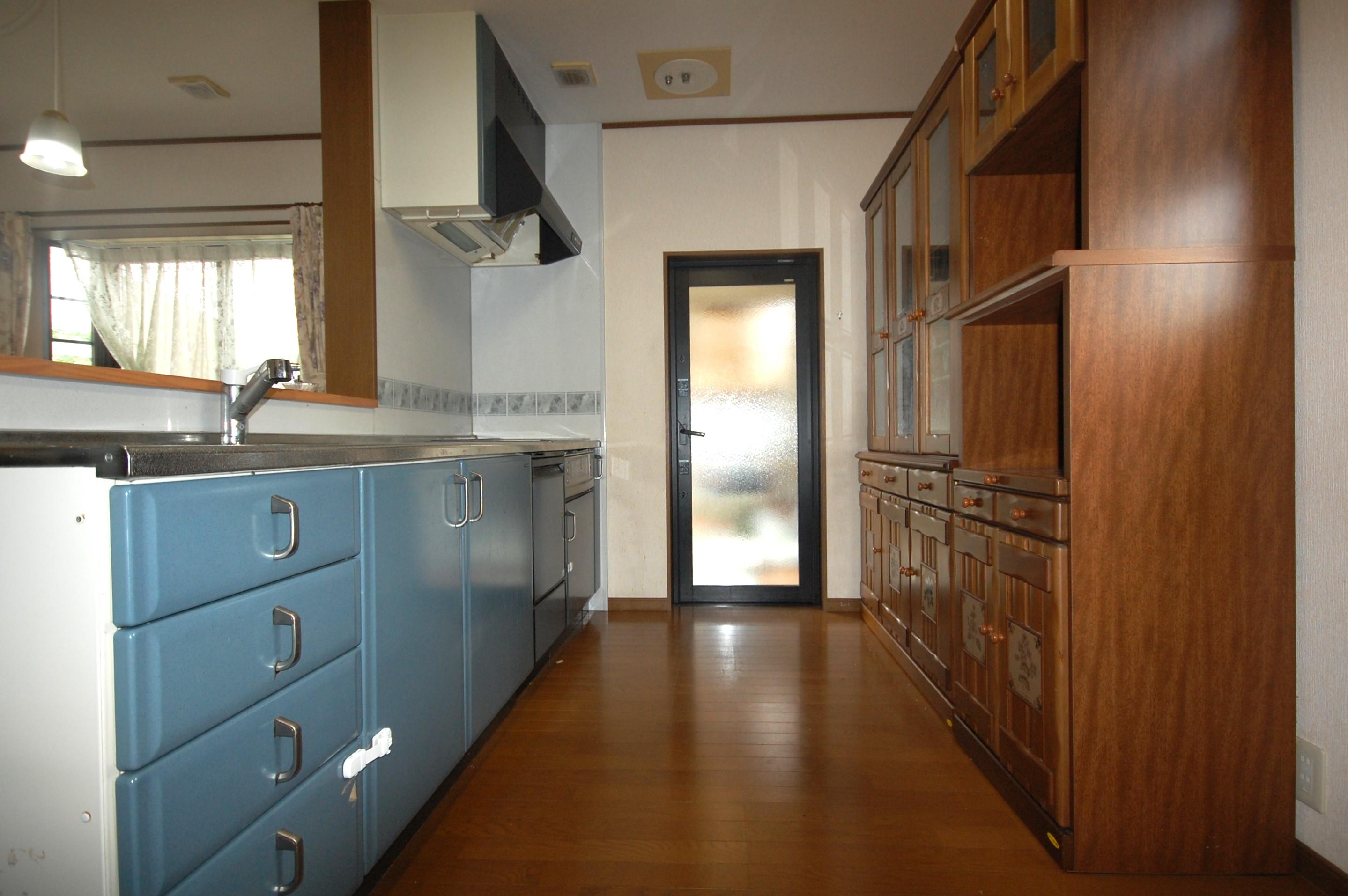 深いブルーの色合いと光の当たり具合によって様々な色のラメが光るキッチン扉は、H様がこだわって選んだお気に入りカラー。収納ユニットもキッチン扉と同じカラーで統一感のあるキッチン空間となりました♪