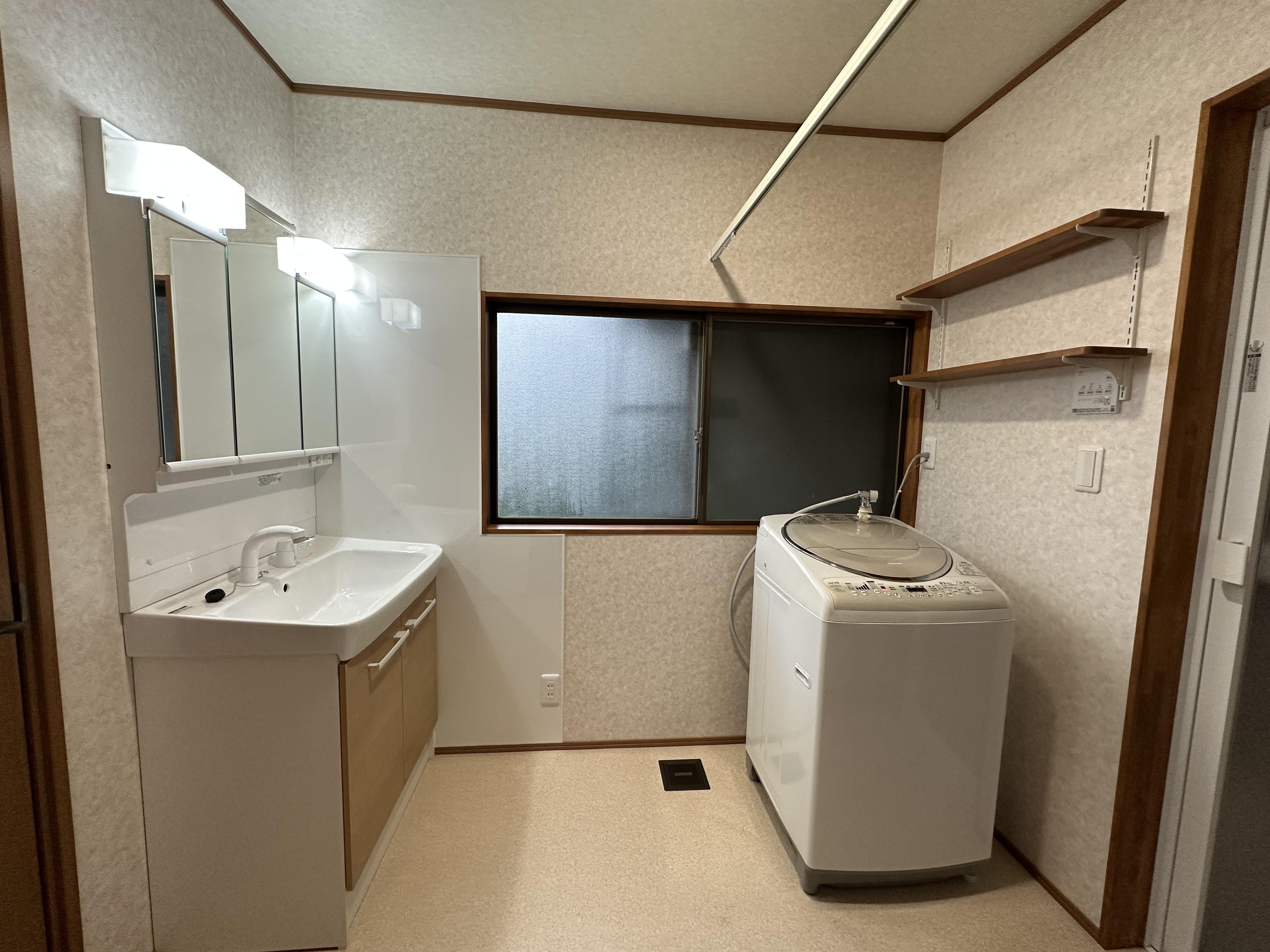 洗濯機の上にあった収納ボックスは撤去し、奥様が洗濯用洗剤などを置きやすい棚を設置。天井と壁のクロス選びは、営業担当者が提案させていただきながら最終決定しました。T様ご夫婦がこれから快適に過ごせるよう入念に打合せを重ね、イメージ通りの浴室・脱衣室が完成しました♪