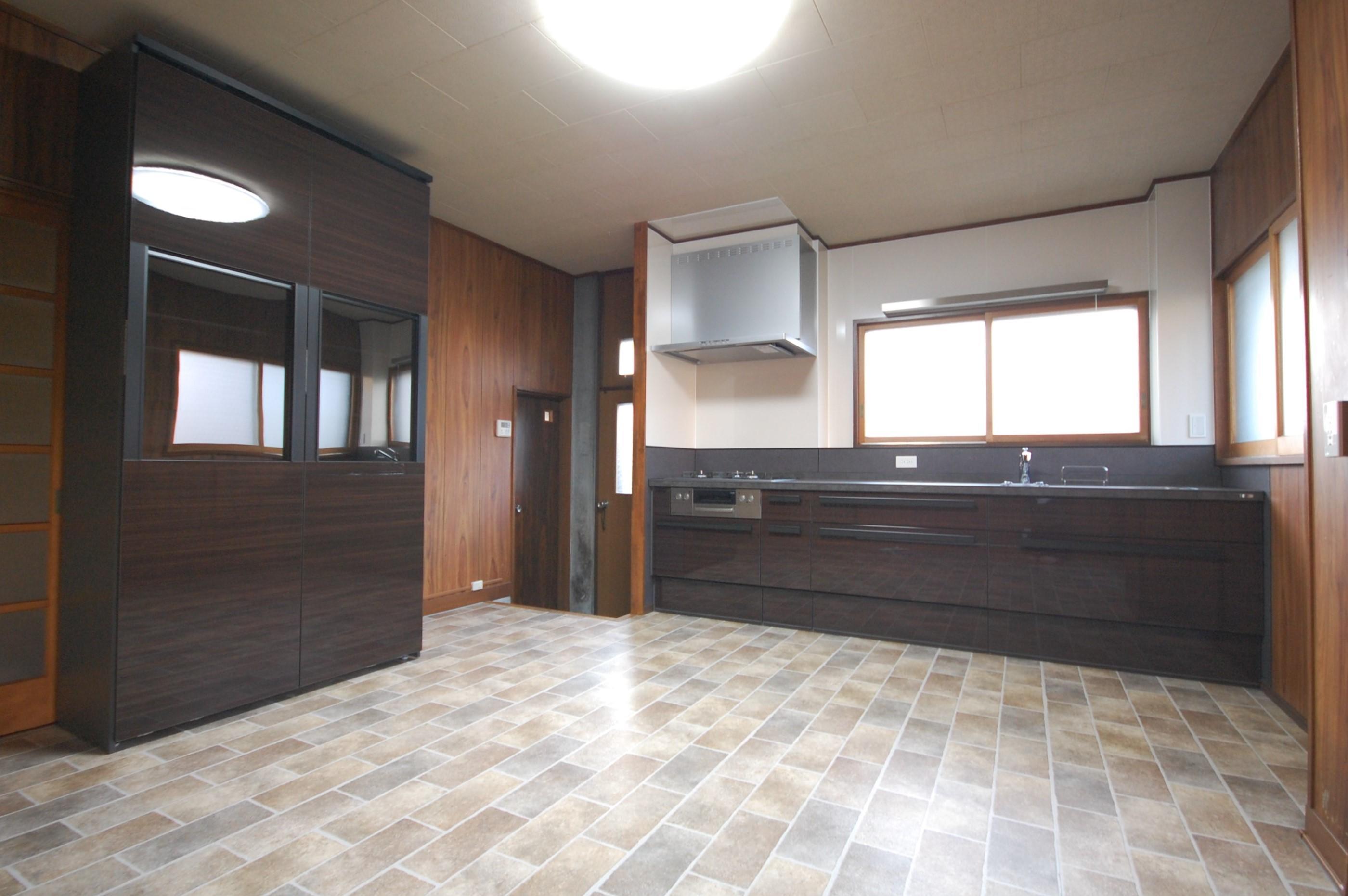 キッチンリフォームのご紹介です。以前の壁付キッチンからレイアウトはそのままに、リクシル最大級キッチン「リシェルSI」に取替をしました。使いやすさとデザイン性の高いこちらのキッチンと同じデザインの食器棚は、壁面全体を収納できる大容量収納です。床もフロアタイルに貼替えをして雰囲気がガラリと変わりました。既存の壁など、まだまだ残せる部分はそのままに、バランスを考えたこだわりのシックな配色でさらに重厚感があります。