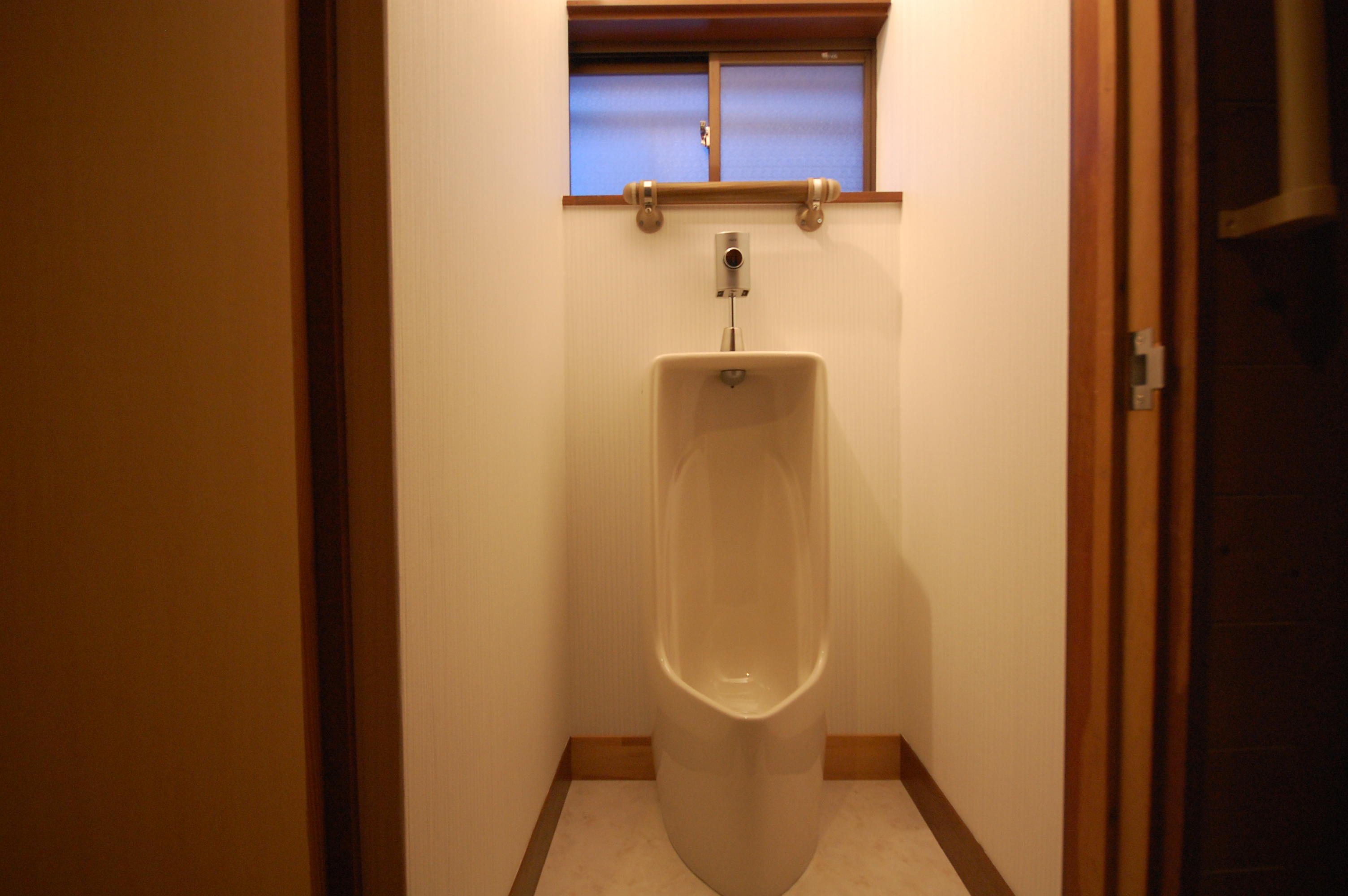 汲取りトイレから下水道へ切り替えをし、水洗化しました。便器はリクシルの「サティス」です。手前に手すりを取り付けたことで、高齢の方でも無理なく使用できます。手すり自体は以前からの慣れ親しんだものを再利用しました。小便器も取替をし、掃除もしやすくシンプルで使い勝手のいいトイレ空間です。