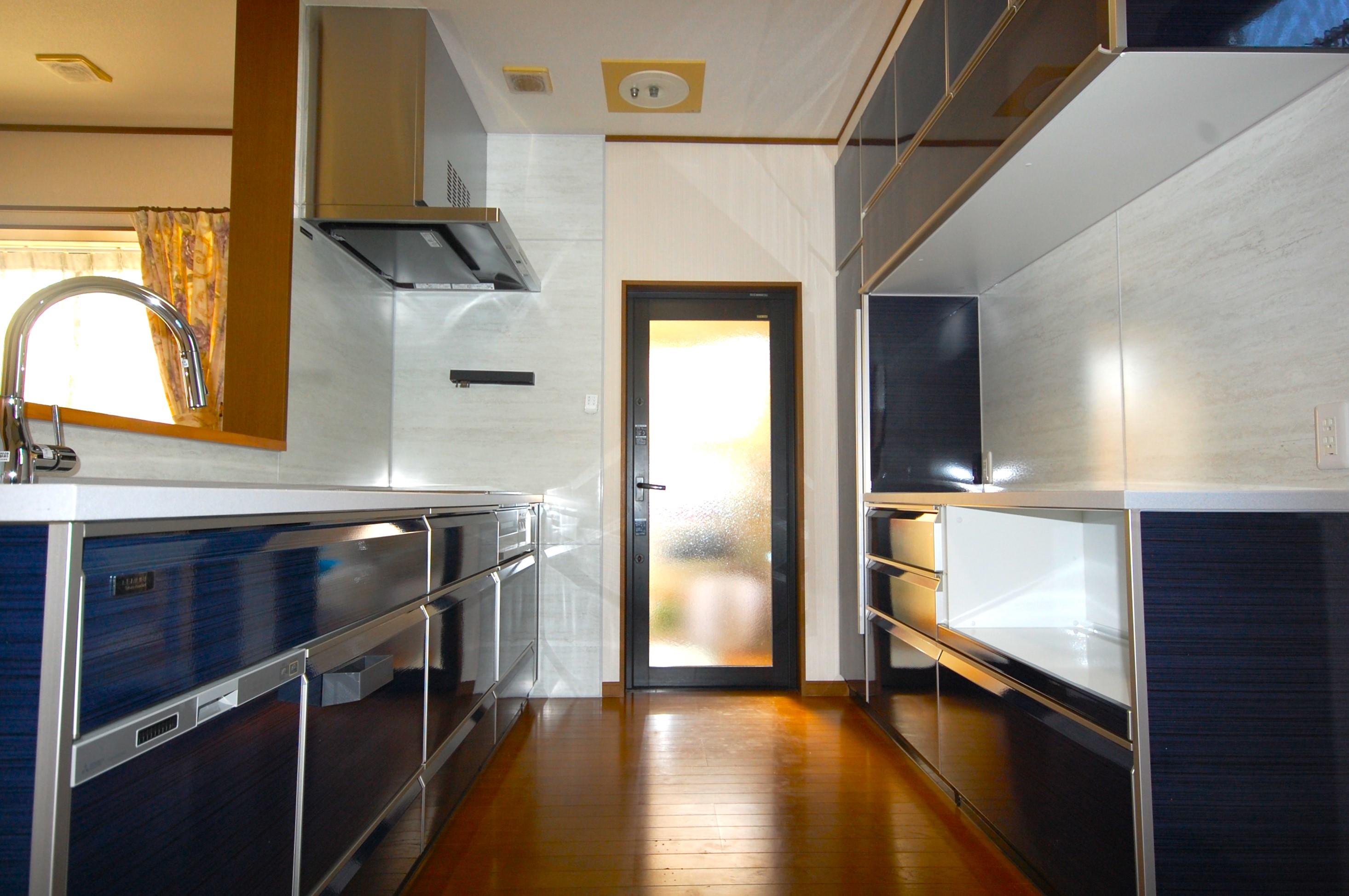 深いブルーの色合いと光の当たり具合によって様々な色のラメが光るキッチン扉は、H様がこだわって選んだお気に入りカラー。収納ユニットもキッチン扉と同じカラーで統一感のあるキッチン空間となりました♪