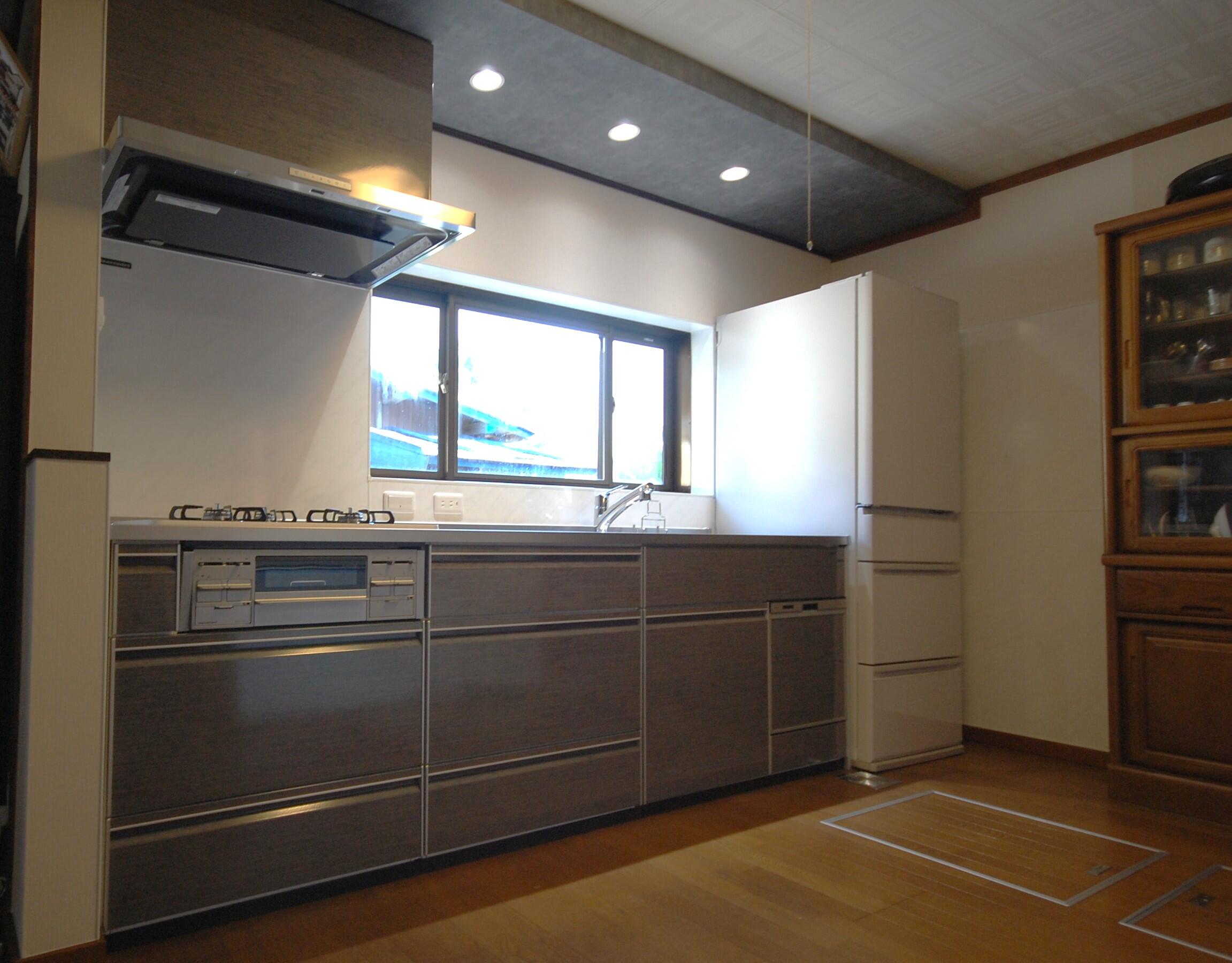 キッチンリフォームのご紹介です。老朽化による漏水などでキッチンの取替えを検討していたA様。タカラのシステムキッチン「トレーシア」に交換しました。「らくエルシンク」は、大きなフライパンもゆったりと洗える奥行き50㎝の広々シンク。汚れやすい排水口は継ぎ目が無くお掃除楽ちんです。また、吊戸棚は撤去し埋め込み式ダウンライトを取付けたことで開放的な印象に。木調からコンクリート調のデザインになったことでお部屋の雰囲気がガラッと変わり、落ち着きのあるスタイリッシュなキッチン空間になりました♪