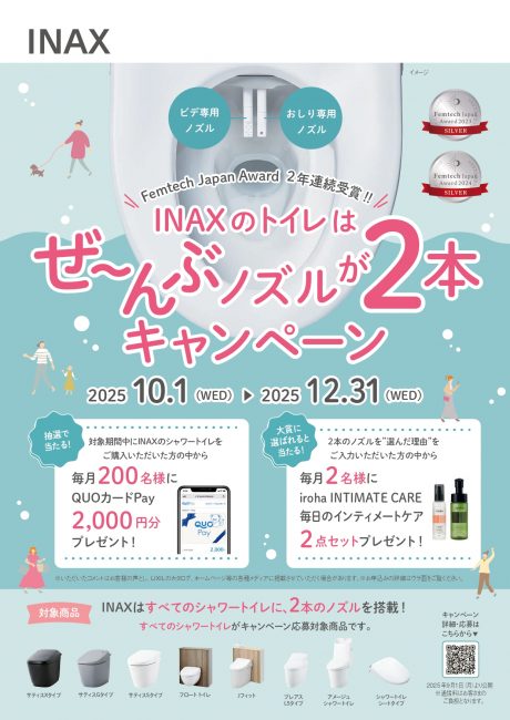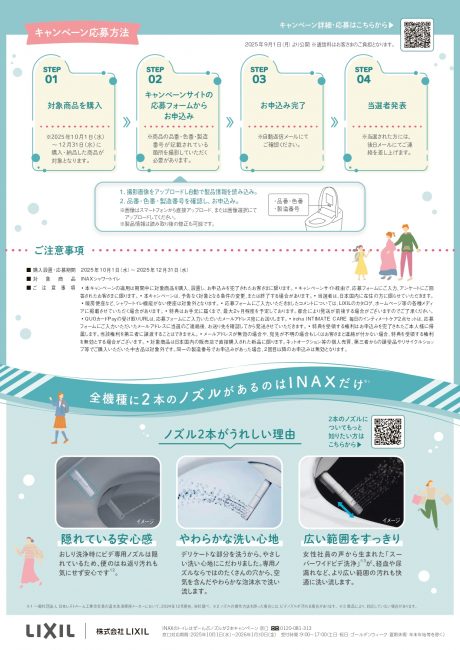 期間中にINAXのシャワートイレを購入いただいた方から抽選で