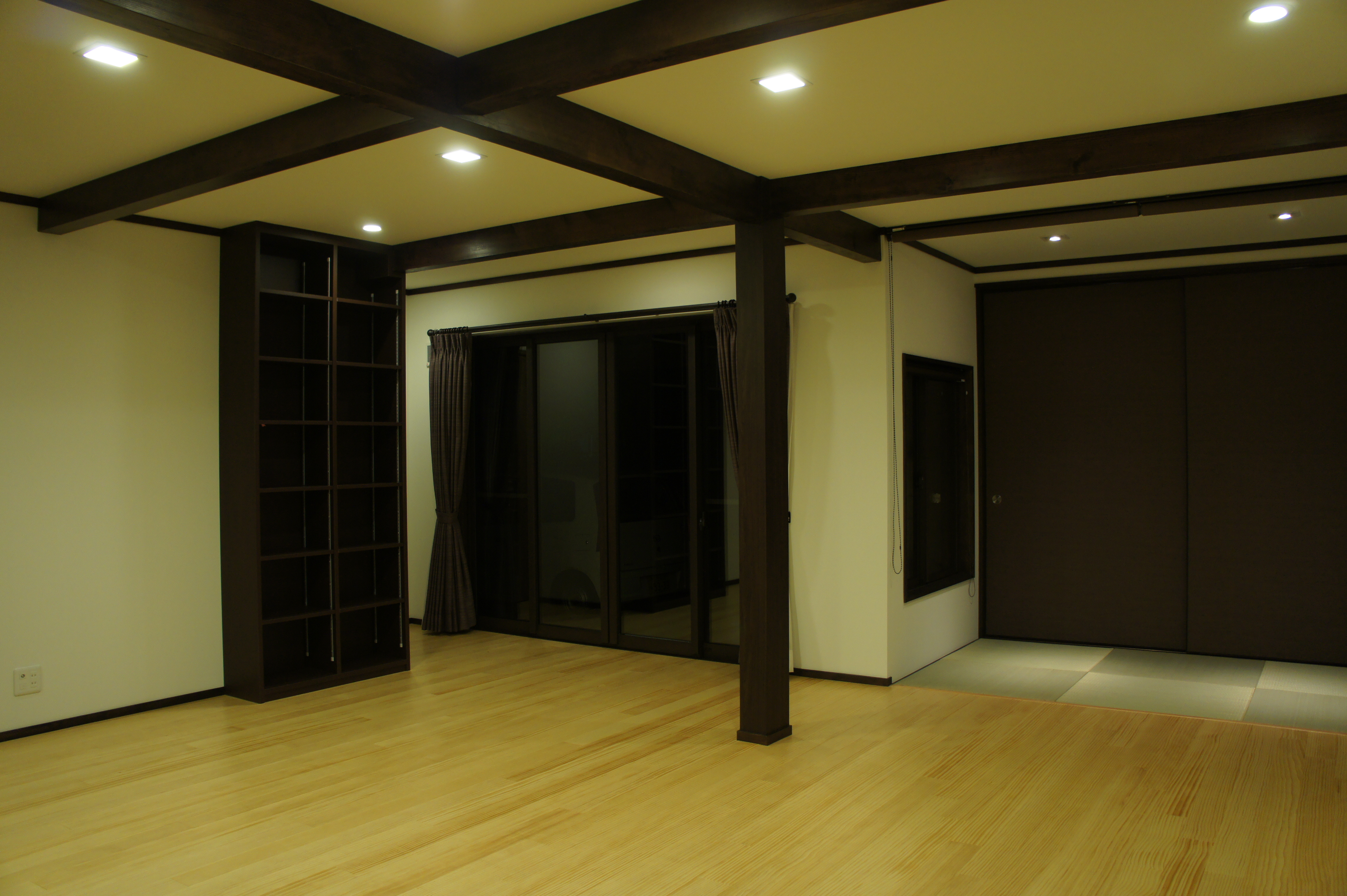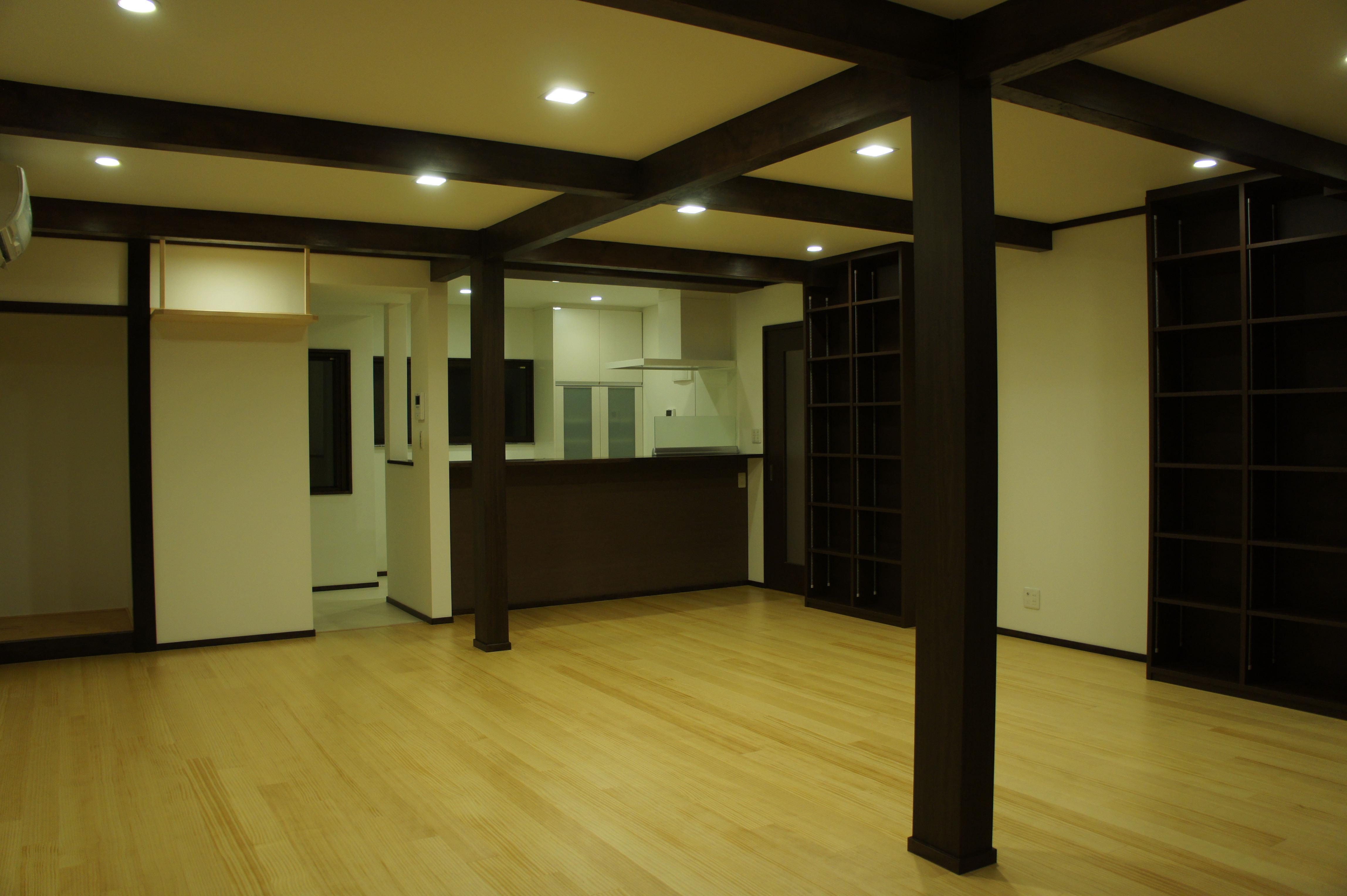 使いにくかった細切れの和室3間をワンルームにリフォーム。暗く閉ざされたキッチンも対面式にして明るい空間に。洋間だけど和を感じる空間にと梁を見せ、壁の色とのコントラストを楽しんでいます。床材は無垢の浮づくりを採用して、チワワのMちゃんが滑らないように配慮しました。リビング、キッチンを改めて断熱施工しているので、真冬の朝も体感温度が他の部屋と違うと喜んでいただいてます。