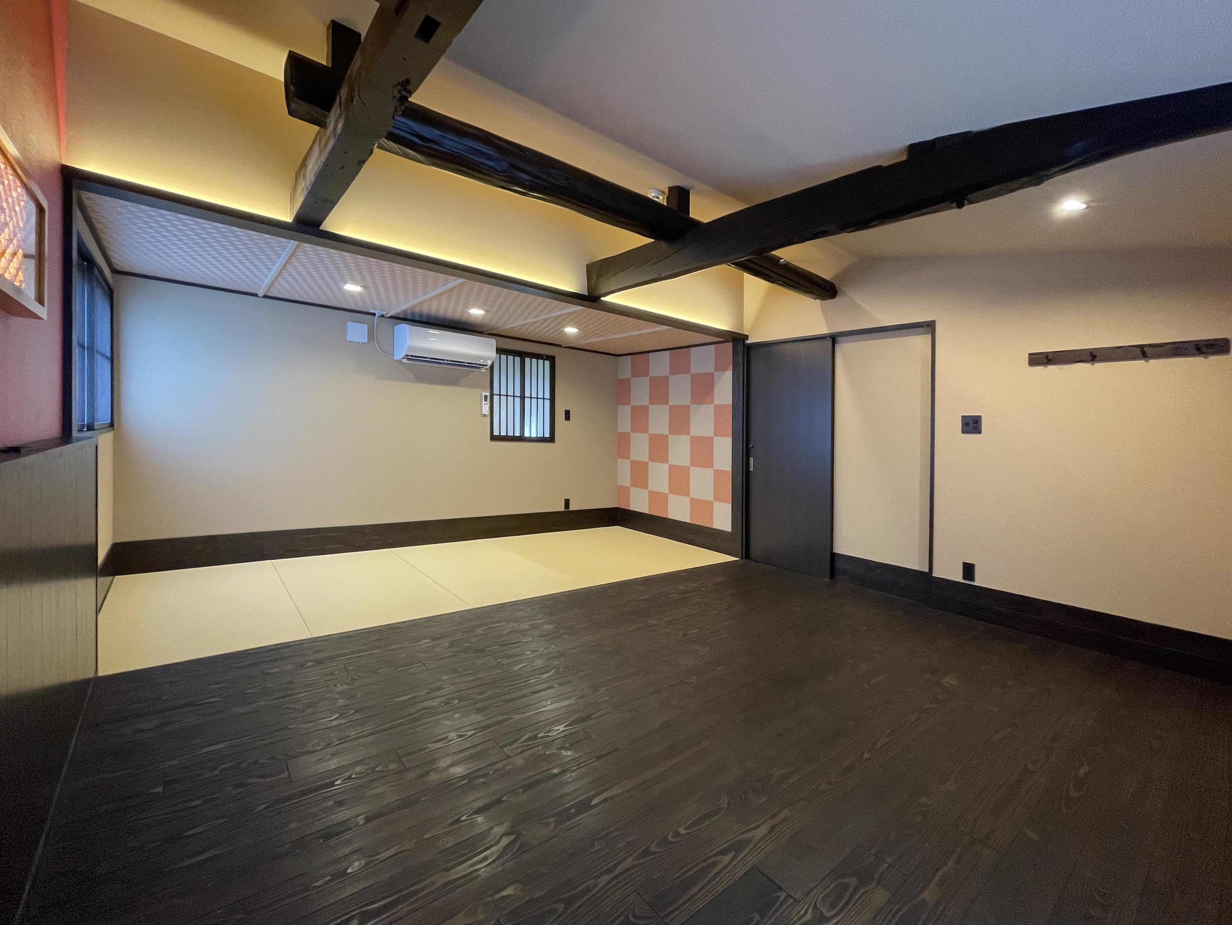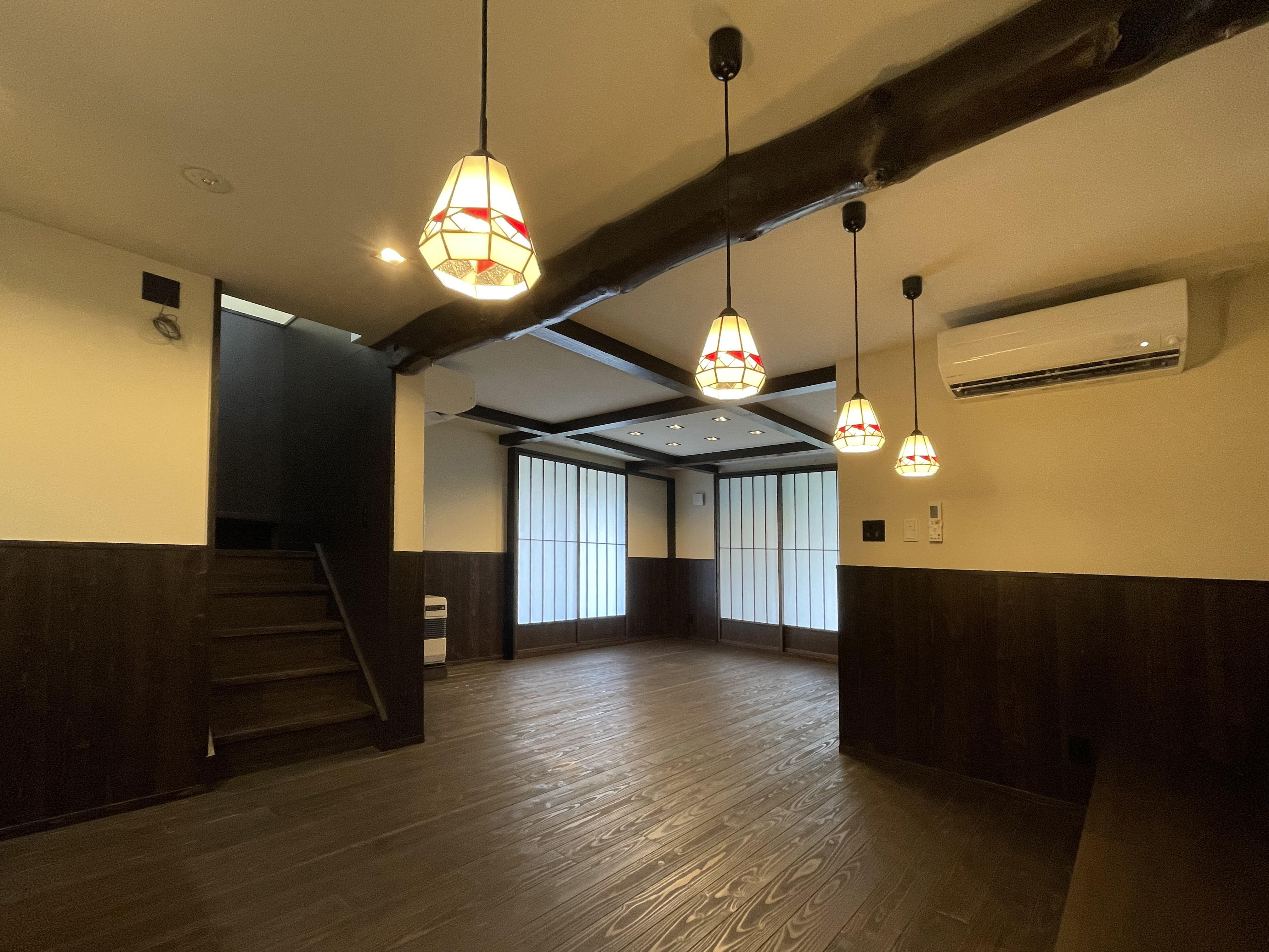 2階も大きく解体し、1部屋に最大4名が泊まれる空間に。欄間照明がアクセントクロスに負けていません!