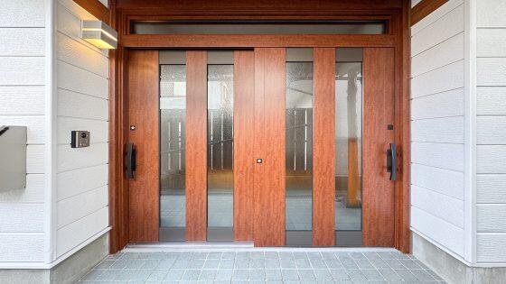 外壁は塗装し、玄関戸はLIXIL リシェントを施工。 和風な印象を払拭する為、 大きめな硝子デザインのものを選定。